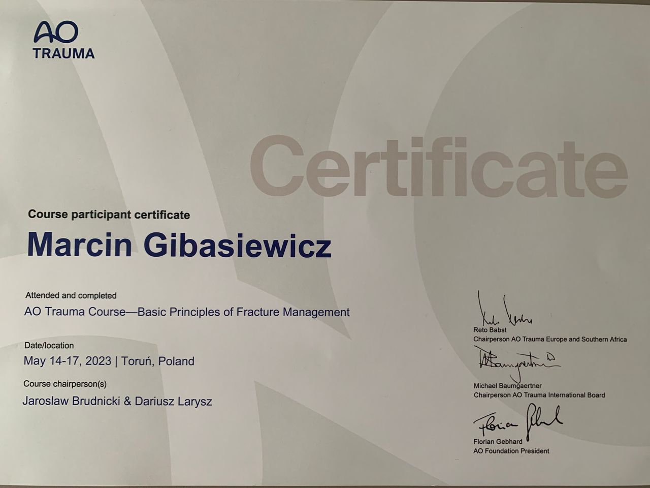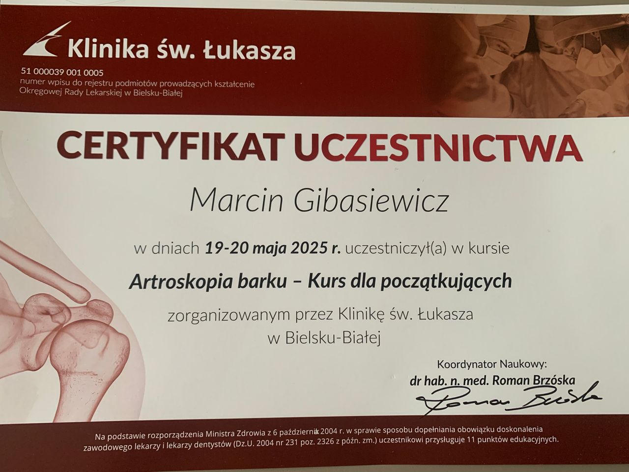 Lekarz w trakcie specjalizacji z ortopedii i traumatologii narządu ruchu. Ukończone z wyróżnieniem studia lekarskie na Uniwersytecie Medycznym im. Piastów Śląskich we Wrocławiu. Szczególne zainteresowanie w zakresie schorzeń kończyny górnej, endoprotezoplastyki dużych stawów, leczenia następstw złamań.