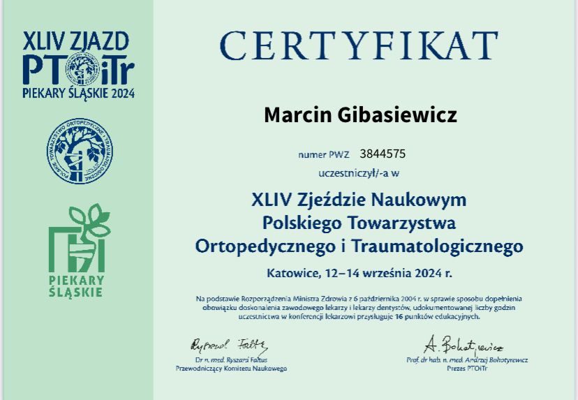 Jaki jest zakres porad oferowanych przez Marcin Gibasiewicz ?Marcin Gibasiewicz to w trakcie specjalizacji (ortopeda). Na podstawie swojego doświadczenia i wykształcenia Marcin Gibasiewicz oferuje usługi takie jak: konsultacja ortopedyczna, konsultacja ortopedyczna + USG, punkcja stawów.