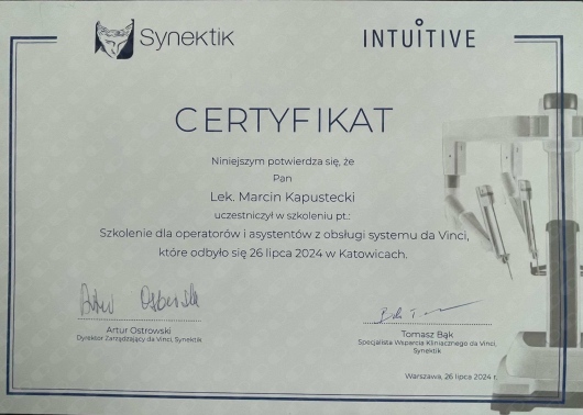 Byłem dziś na wizycie u Pana Doktora Marcina Kapusteckiego i chciałbym podzielić się pozytywną opinią. Pan Doktor wykazał się dużym profesjonalizmem i życzliwym podejściem do pacjenta. Wszystko zostało mi dokładnie wyjaśnione, a sama konsultacja przebiegła w spokojnej i rzeczowej atmosferze. Rozpoczynam leczenie więc na efekty trzeba będzie poczekać. Polecam Pana Doktora z czystym sumieniem.