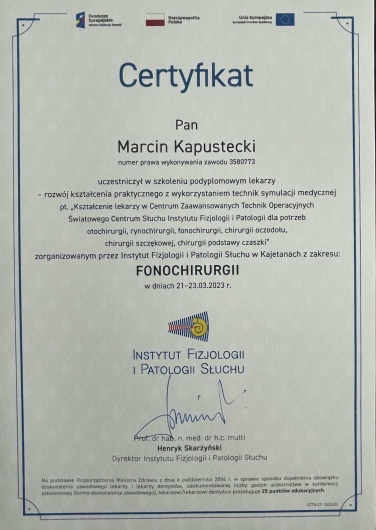 Członek Polskiego Towarzystwa Otorynolaryngologów Chirurgów Głowy i Szyi, regularnie podnosi swoje kwalifikacje, uczestnicząc w licznych szkoleniach, kursach i kongresach naukowych w Polsce oraz za granicą.