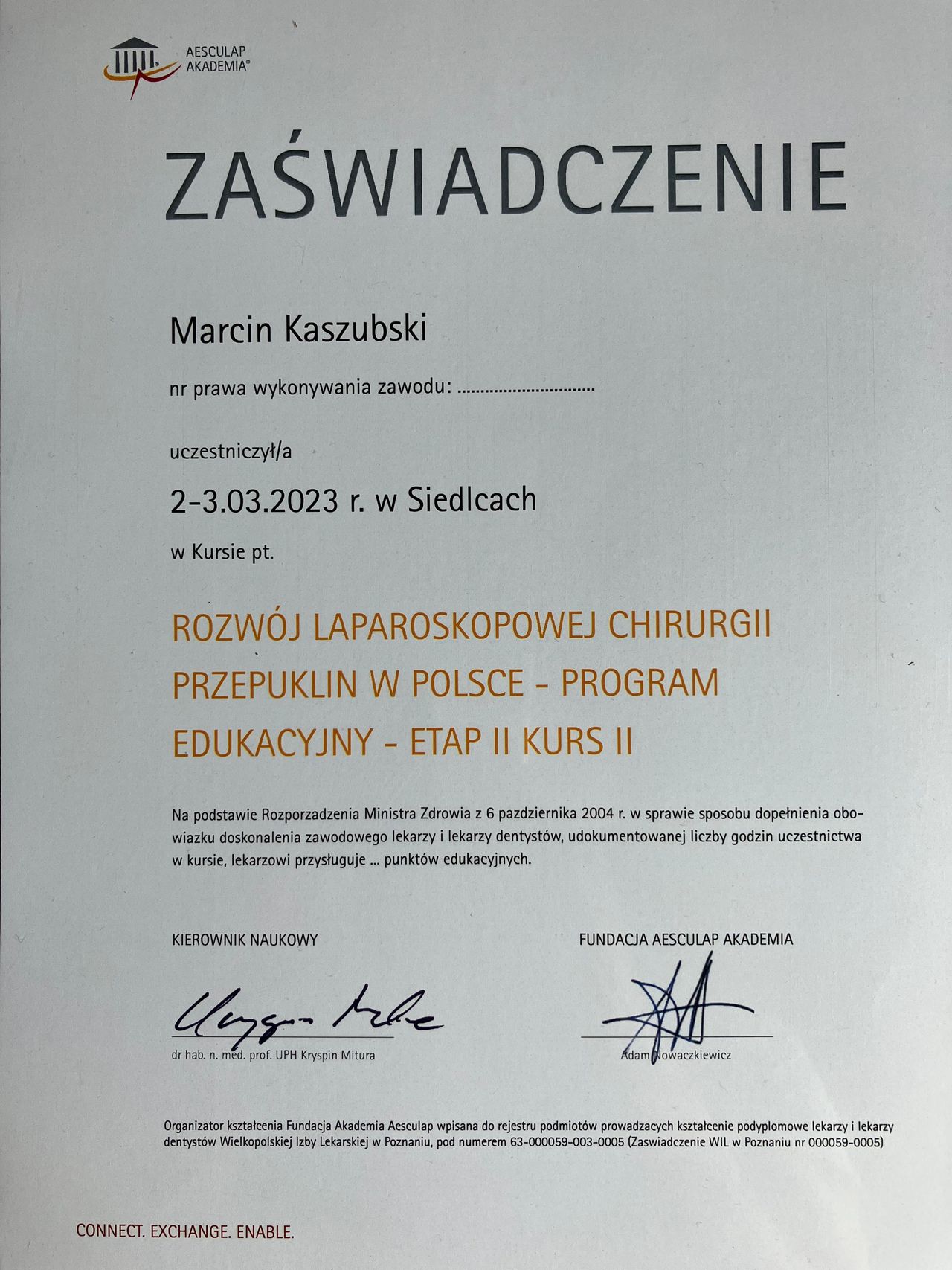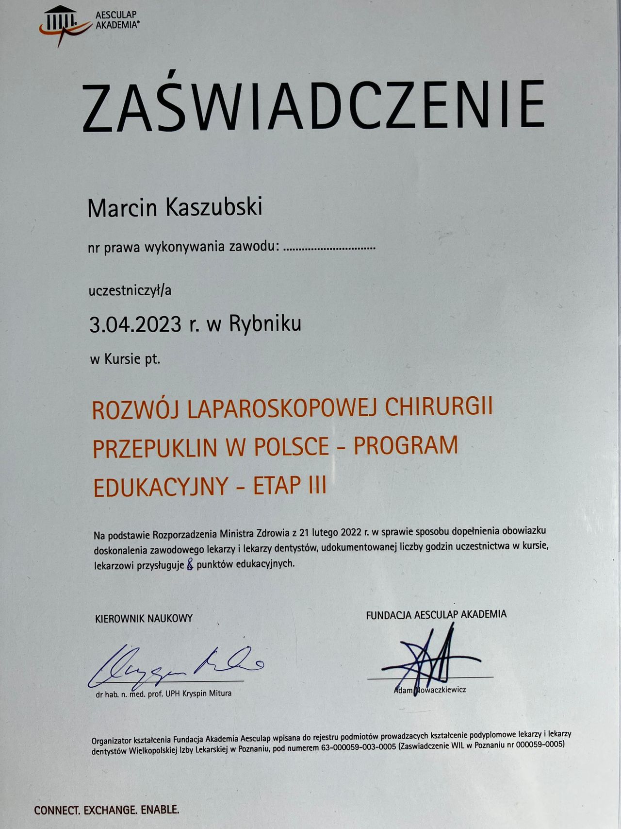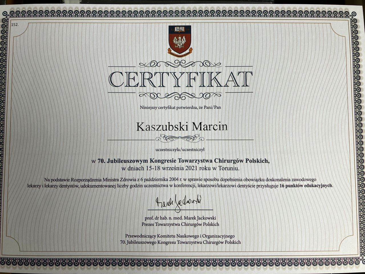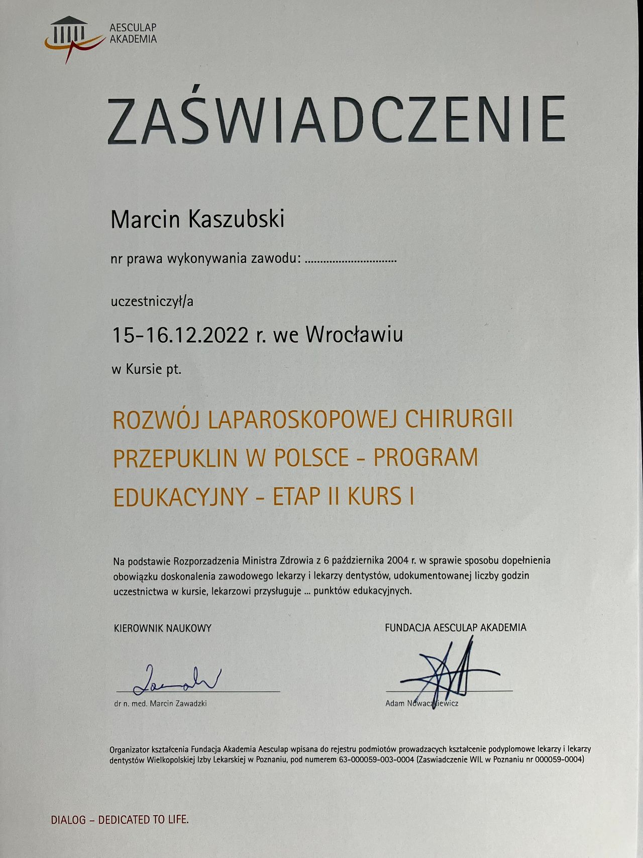 Nieustannie rozwijam swoje kompetencje, biorąc udział w krajowych i międzynarodowych konferencjach oraz szkoleniach. Ukończyłem certyfikowany program szkoleniowy Hernia Master, który pogłębił moją wiedzę i umiejętności w zakresie leczenia przepuklin.