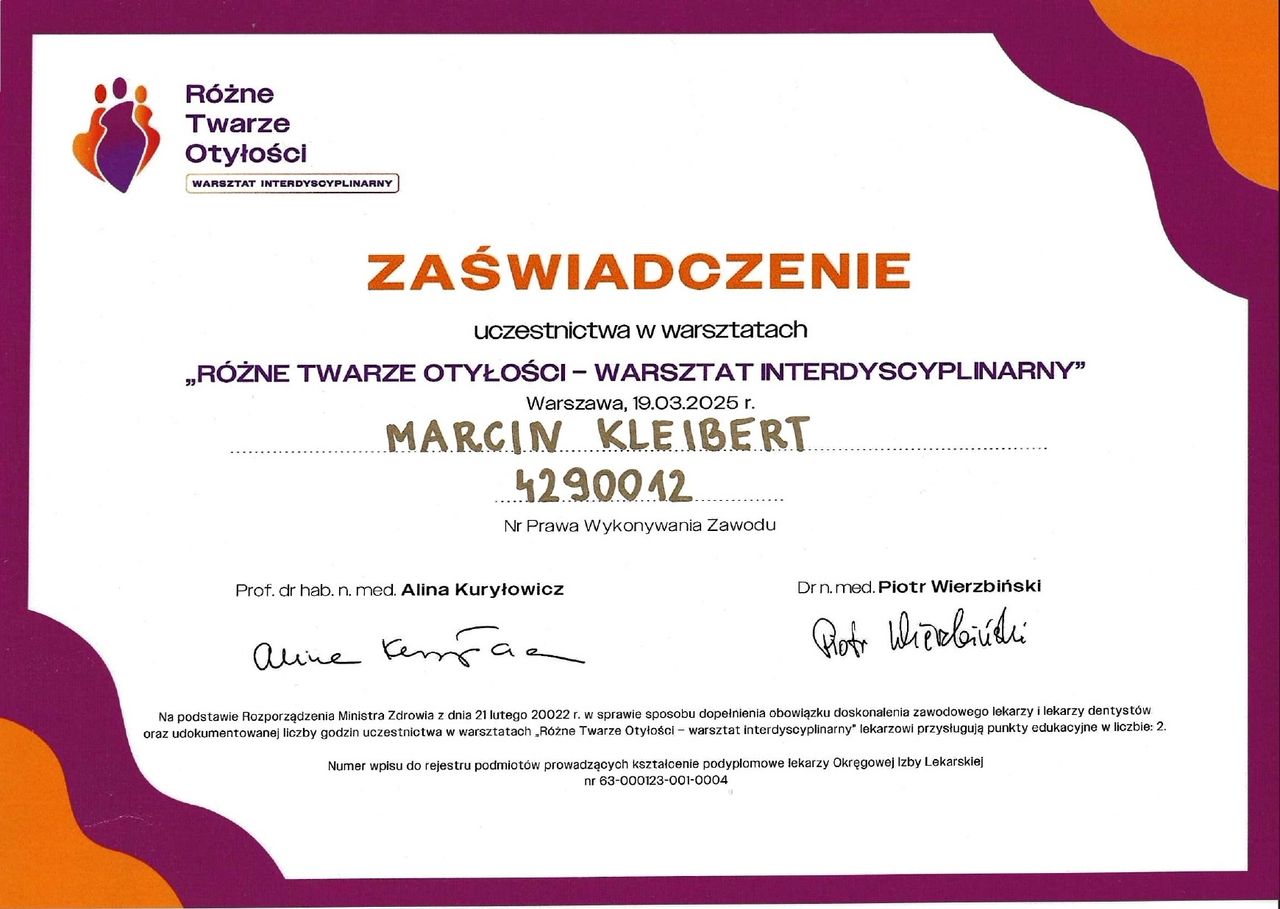 Certyfikowany obesitolog (ukończony kurs I i II stopnia Polskiego Towarzystwa Badań nad Otyłością).