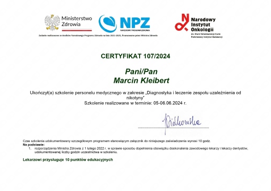 Certyfikowany lekarz zajmujący się diagnostyką i leczeniem zespołu uzależnienia od nikotyny (ukończony kurs prowadzony przez Narodowy Instytut Onkologii).