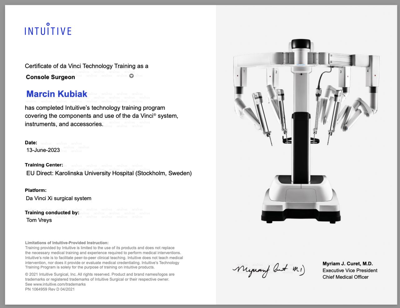 Dr Kubiak jest wykwalifikowanym praktykiem, edukatorem i ekspertem w dziedzinie innowacji medycznych. Posiada prestiżowy status proktora Intuitive – jako międzynarodowy trener szkoli innych lekarzy w zakresie bezpiecznego i skutecznego przeprowadzania operacji przy użyciu systemów robotowych, ze szczególnym uwzględnieniem systemu da Vinci 5. Wykorzystanie tych zaawansowanych rozwiązań technologicznych przekłada się dla pacjentów na precyzję zabiegu, mniejsze obciążenie organizmu i szybszy powrót do pełnej aktywności.