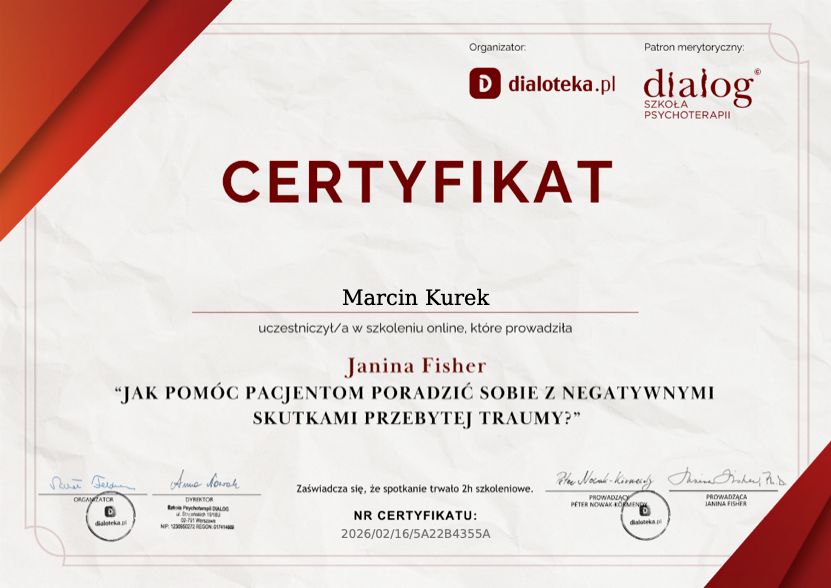 Z całego serca polecam tego terapeutę. To osoba bardzo empatyczna, uważna i profesjonalna. Od pierwszego spotkania czułam się wysłuchana i traktowana z szacunkiem. Terapia prowadzona jest w spokojnej, bezpiecznej atmosferze, a metody pracy są jasno tłumaczone i dopasowane do indywidualnych potrzeb. Dzięki tym spotkaniom lepiej rozumiem siebie, swoje emocje i mechanizmy działania. To ogromne wsparcie i realna pomoc w codziennym życiu.• Fractal Insight Marcin Kurek • Konsultacja psychologiczna online •