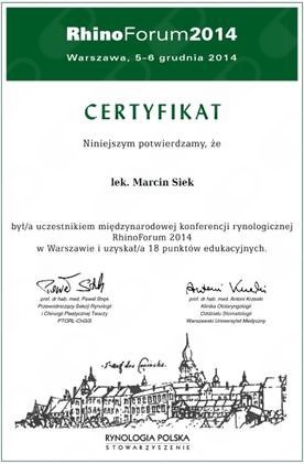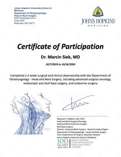 Systematycznie podnoszę swoje umiejętności zawodowe poprzez uczestnictwo w kursach i szkoleniach – kurs endoskopowych operacji zatok, kurs protez głosowych (Warszawa 2012/13/14, Wrocław 2014, Poznań 2015, Bydgoszcz 2021, Warszawa 2023). W październiku 2024r odbyłem staż naukowy w Johns Hopkins University School of Medicine, Department of Head & Neck Surgery (Bethesda, USA).