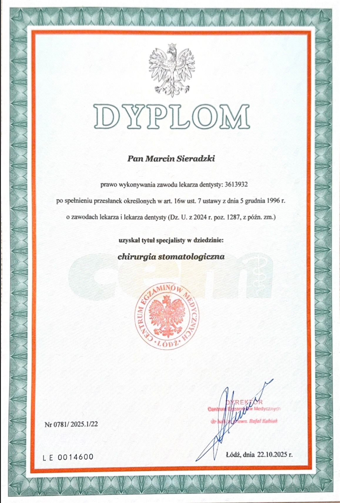 Absolwent kierunku lekarsko-dentystycznego Uniwersytetu Medycznego im. Karola Marcinkowskiego w Poznaniu. Pasjonat chirurgii stomatologicznej i implantologii, dla którego precyzja i rozwój to codzienny standard pracy. Państwowy Egzamin Specjalizacyjny zdał z jednym z najwyższych wyników w kraju, uzyskując tytuł specjalisty chirurgii stomatologicznej.