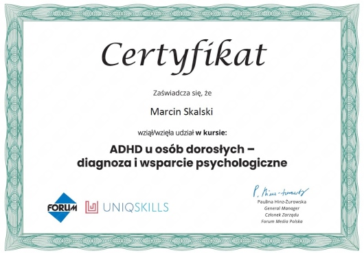Jaki jest zakres porad oferowanych przez Marcin Skalski?Marcin Skalski to psycholog. Na podstawie swojego doświadczenia i wykształcenia Marcin Skalski oferuje usługi takie jak: Konsultacja psychologiczna, opinia psychologiczna, Psychotesty dla kierowców i operatorów, Wizyta domowa, Usługa szkoleniowa (tematyka do ustalenia), Badanie EEG Biofeedback, Diagnoza ADHD, terapia par, relaksacja, Konsultacja psychologiczna online.