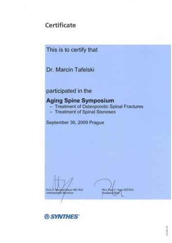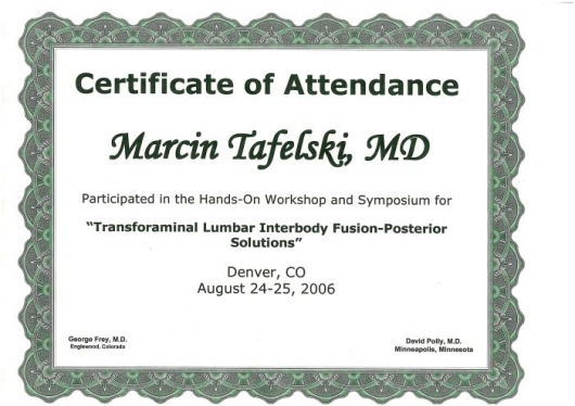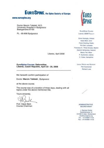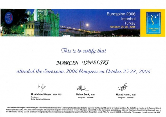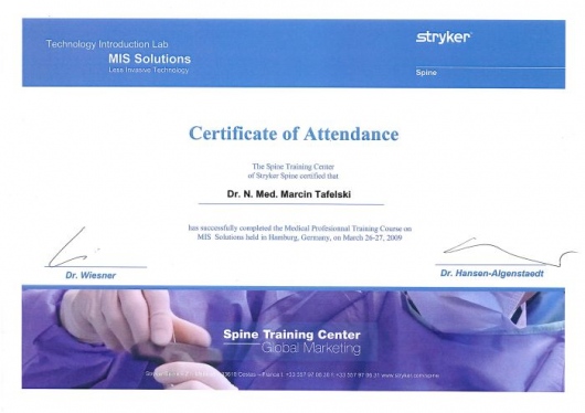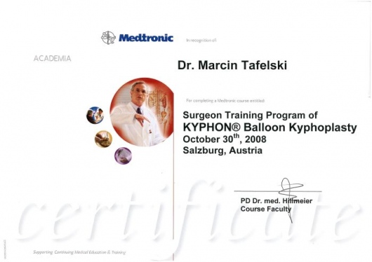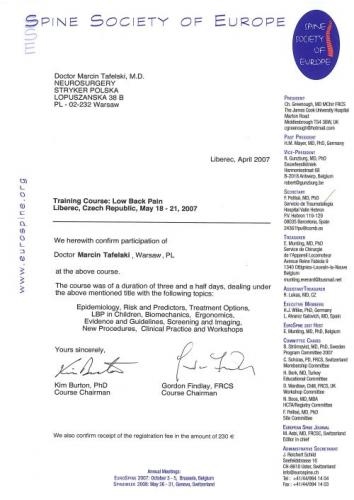Do chwili obecnej regularnie podnoszę swoje kwalifikacje uczestnicząc w specjalistycznych szkoleniach z zakresu chirurgii kręgosłupa w Europie i Stanach Zjednoczonych.