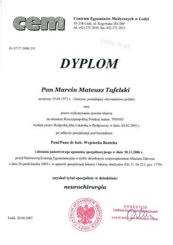 Stopień doktora nauk medycznych, oraz tytuł specjalisty w dziedzinie neurochirurgii uzyskałem w 2016 roku.