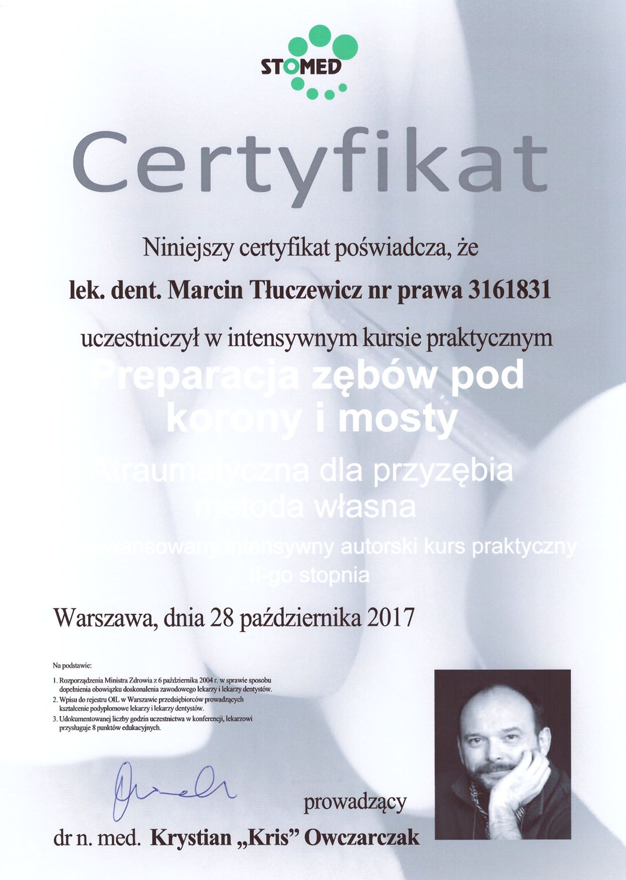 Preparacja zębów pod korony i mosty. Atraumatyczna dla przyzębia metoda własna. Intensywny kurs II stopnia – dr n.med. Krystian Owczarczak