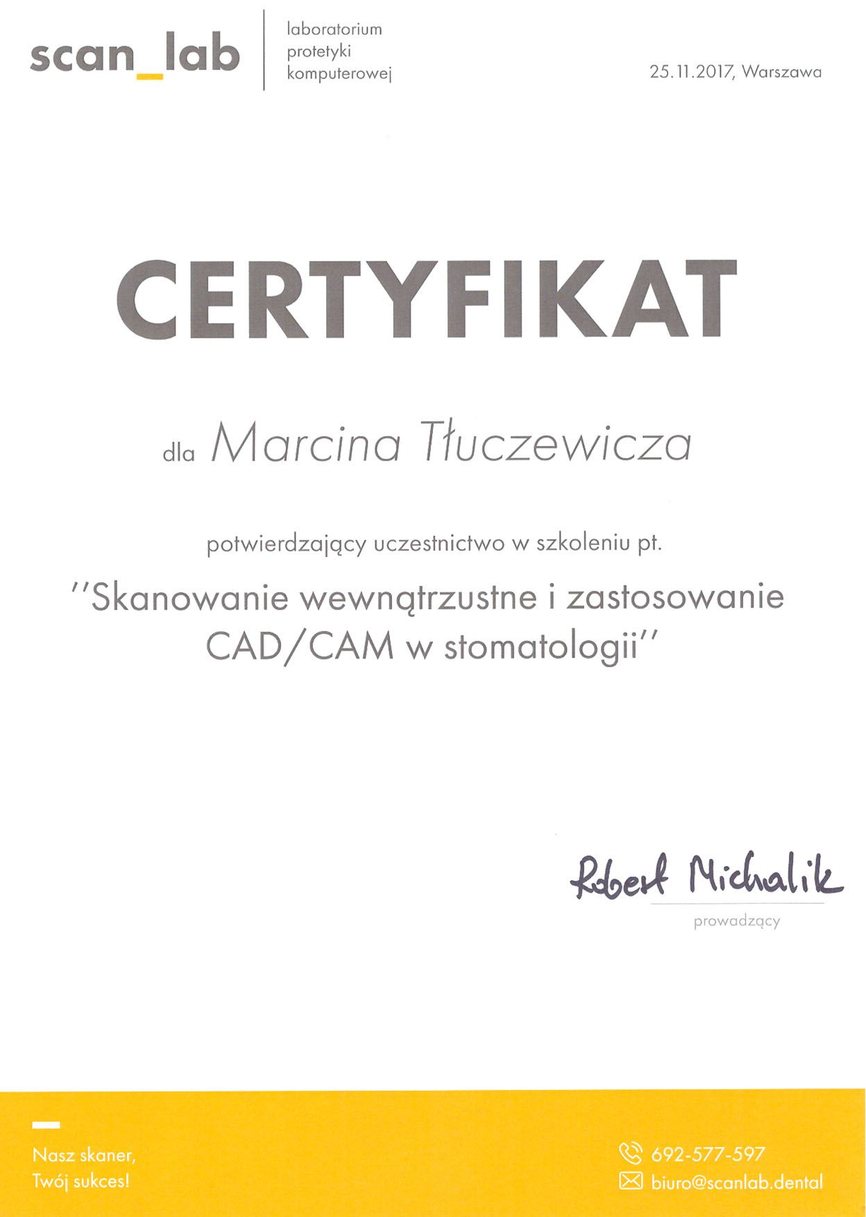 Z grubsza "współpracę" oceniam neutralnie, mimo że finalnie problem, z którym się zgłosiłam do doktora Tłuczewicza rozwiązany przez niego nie został, a kwestie natury organizacyjnej to był trochę jakby chaos organizacyjny :) Pierwsza wizyta wydawała się full profesjonalna. Nakreślony został plan działania. Logikę procesu, na wystarczającym na mój gust poziomie ogólności, ogarnęłam. Miały być niby dwie wizyty na zrobienie wizualizacji, a potem zabieg. Sporym mankamentem były bardzo odległe terminy - około miesiąc oczekiwania między wizytami. Tego typu planowanie z dalekim wyprzedzeniem u mnie się nie sprawdzało. Najpierw, kilka dni przed wizytą zmarła mi matka, na wizycie planowanej w kolejnym miesiącu wypadły mi sprawy służbowe, a na wizycie planowanej za kolejne 2 mce siedziałam na L4... I tym oto sposobem od września do stycznia temat ruszony nie został. Kolejna wizyta była planowana na koniec stycznia. Nastawiałam się, że realizujemy plan działania nakreślony na początku przez Pana Tłuczewicza, czyli wpierw dwie wizyty na wizualizacje, a tymczasem uzyskałam informacje, że jest na niej planowany zabieg. Poprosiłam o informację w sprawie kosztów i zapytałam czy się harmonogram prac zmienił, bo niby wcześniej miały być dwie wizyty na wizualizacje. W grudniu co prawda pytałam czy jest opcja, żeby wpierw zęba wyrwać, ale się dowiedziałam, że jak bez wizualizacji to będzie wyglądało identycznie jak teraz. Teraz wygląda kiepsko, więc przyjęłam bezdyskusyjnie, że robimy wg harmonogramu z wizualizacjami. A tu nagle info, że zabieg... Akurat zabieg wtedy mi nie pasował, bo miałam badania. Do dnia wizyty nie dowiedziałam się nic o kosztach, o które zapytałam, ale miałam też do zrobienia inny ząb, który w międzyczasie się ukruszył, więc wizytę jak najbardziej reflektowałam. Tym razem się jednak okazało, że wizyty nie będzie, bo dr Tłuczewicz nie wiedział czy przyjdę, więc mnie wykreślił. Ok, 3:1. Niech będzie. Wyznaczony został kolejny termin na 09.02, z informacją z ich strony, że potwierdzą 07.02. Z mojej strony byłam w pełnej gotowości, coby przedmiotowy problem wreszcie ogarnąć. Potrzebowałam tylko w dalszym ciągu feedback, ile mam mieć piniundzów i czy robimy zabieg czy co? W dniu 07.02 ani 08.02 żadnej informacji telefonicznej ws wizyty nie dostałam. Dnia 08.02 w godzinach popołudniowych wysłali mi majla, którego odebrałam dzień później. W dniu rzekomej wizyty... W tym momencie nie miałam już możliwości ani żeby wziąć urlop na kolejny dzień/dwa, jakby był zabieg, ani obskoczenia przed wizytą banku, w przypadku jakby większa gotówka była potrzebna, więc nawet już nie podjęłam kolejnej próby ustalenia, co byłoby robione na wizycie ani, jakie są koszty. Finalnie skapitulowałam i podziękowałam za współpracę, nie widząc szansy na powodzenie tego biznesa. Natomiast w całej tej telenoweli miałam mega głupie szczęście, że nic nie zostało zrobione. Wczoraj poszłam szukać pomocy gdzieś indziej (duża placówka i termin się znalazł na "już"). W nowej przychodni się uparli na nową tomografię. Średnio mi to w gust przypadło, ale jestem już tak zniechęcona tą sytuacją z zębami, że zbytnio nie protestowałam. I "niespodzianka" - w międzyczasie sztyft rozerwał korzeń drugiego zęba... Gdyby wizyty u Pana Marcina były w szybszych terminach i ogarnęłabym tam protetykę na drugim zębie (na obecnym sztyfcie), w oparciu o TK z czerwca ubiegłego roku to teraz miałabym problem... Więc dobrze wyszło, że się nie potrafiliśmy porozumieć w sprawach organizacyjnych i, że terminy miał z kosmosu :)