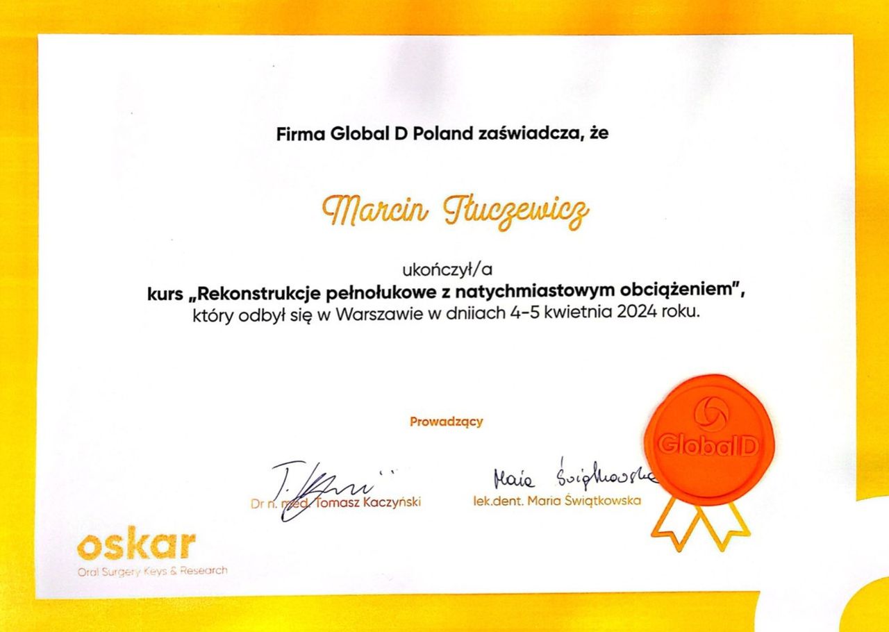 Długo szukałem dobrej kliniki i bardzo dobrego lekarza, który byłby kompetentny, empatyczny i do każdego przypadku podchodził indywidualnie, aż w końcu trafiłem na Pana Doktora Marcina. Mam do zrobienia kilka implantów ale żeby to zrobić musiałem wyleczyć kanałowo dwa zęby sąsiadujące z przyszłym implantem. Byłem wcześniej u dwóch innych lekarzy, którzy powiedzieli że nie uda się tych zębów powtórnie wyleczyć kanałowo i ze będzie trzeba je usunąć. Pan Doktor powiedział ,że jak najbardziej można wyleczyć te zęby i skrupulatnie przez ponad godzinne leczył każdy ząb z osobna. Dzięki doktorowi zachowałem dwa swoje zęby. Mistrzowska robota, dziękuję :)