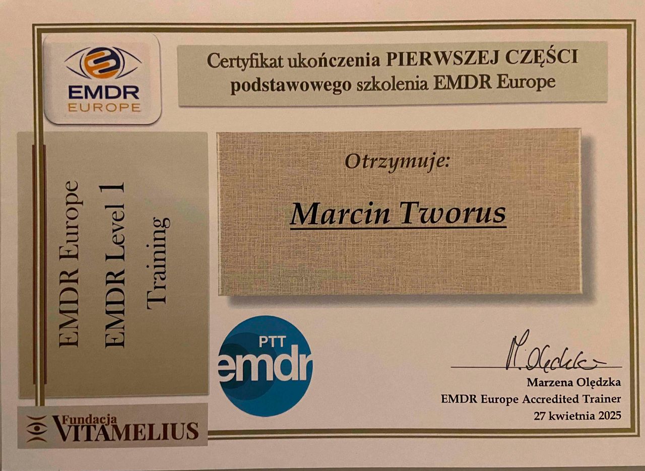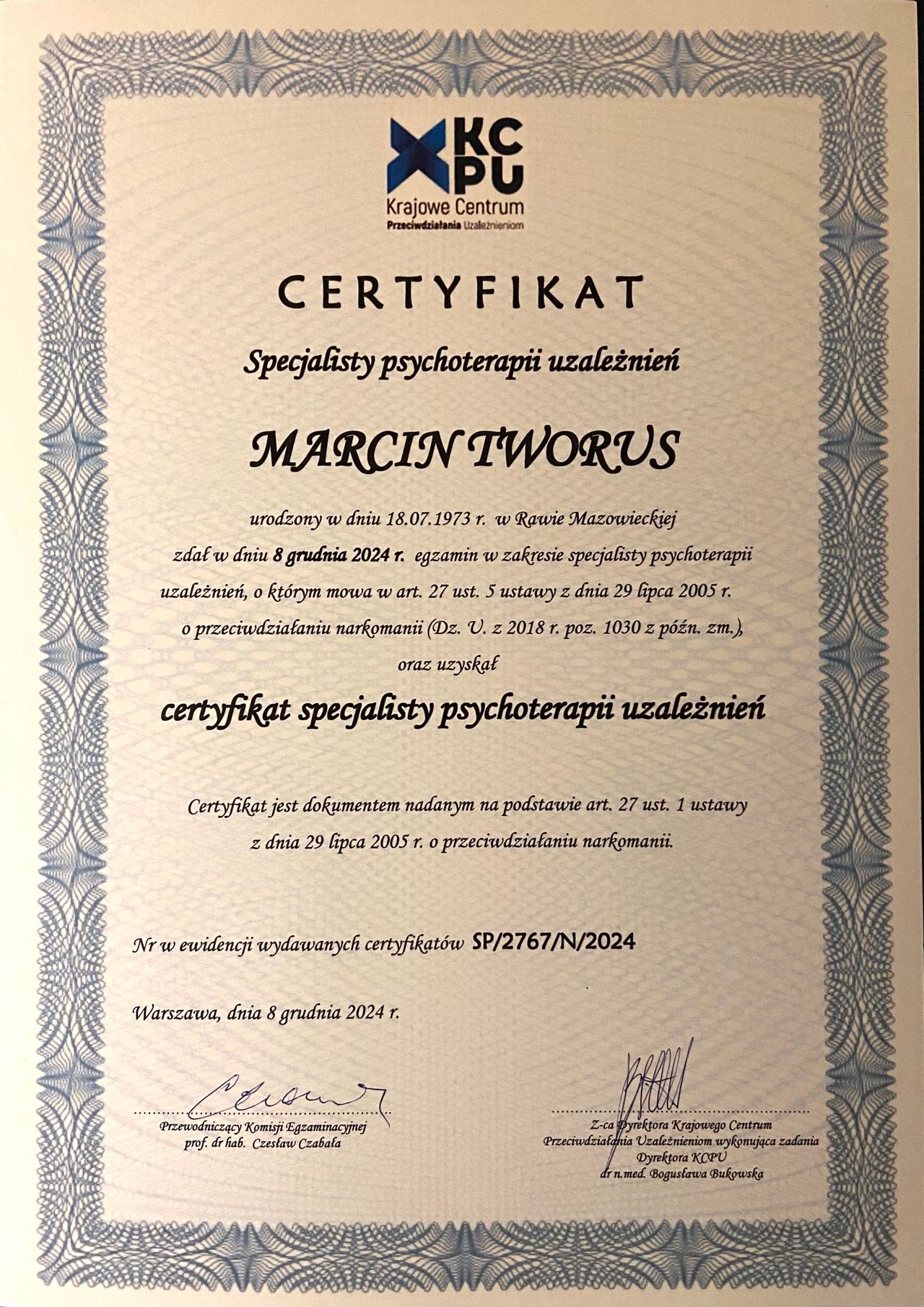 Dzień dobry, nazywam się Marcin Tworus i jestem psychologiem, certyfikowanym specjalistą psychoterapii uzależnień (nr SP/2767/N/2024), certyfikowanym specjalistą pomocy psychologicznej i interwencji kryzysowej oraz coachem. Pracuję w nurcie poznawczo-behawioralnym, jednak lubię również sięgać po techniki z innych nurtów, takich jak psychorysunek, collage czy muzyka. Doświadczenie zdobywałem m.in. w Instytucie Psychiatrii i Neurologii w Warszawie, Poradni Uzależnienia i Współuzależnienia od Alkoholu „PETRA” (jedna z najstarszych w Polsce) w Warszawie, Stowarzyszeniu Eleuteria oraz RTM Private Medica. Udzielam pomocy psychologicznej osobom zmagającym się z lękiem, uzależnieniem od alkoholu/narkotyków, internetu, mającym trudności w nawiązywaniu relacji interpersonalnych oraz z wyrażaniem i kontrolą emocji. Każdego pacjenta postrzegam jako wyjątkową indywidualność z bogatym wewnętrznym światem doświadczeń, emocji, wartości, znaczeń i symboli. Zawsze staram się aktywnie słuchać każdej opowieści, aby zrozumieć jej wielowymiarowość, a co za tym idzie, możliwie jak najlepiej rozpoznać przyczynę problemu, z którym pacjent pojawia się w moim gabinecie. Nie wszyscy potrzebują terapii długoterminowej. Czasami wystarczy zaledwie kilka spotkań z wykorzystaniem posiadanych już przez pacjenta zasobów, aby skutecznie poradzić sobie ze stresem lub problemami dnia codziennego. Może się też zdarzyć, że celem spotkań będzie jedynie zbudowanie motywacji do właściwej terapii lub przygotowanie do wejścia na terapię grupową. Innym razem będzie to praca stricte poznawcza lub wręcz przeciwnie – praca tylko z emocjami. Wszystko zależy od pacjenta, jego oczekiwań i problemu, z jakim pojawia się w moim gabinecie. Psychoedukację uważam za bardzo istotny element oddziaływań, czyli wyjaśnienie i poznanie mechanizmów niepożądanych zachowań oraz tego, co za nimi stoi. Swoją pracę poddaję regularnej superwizji.