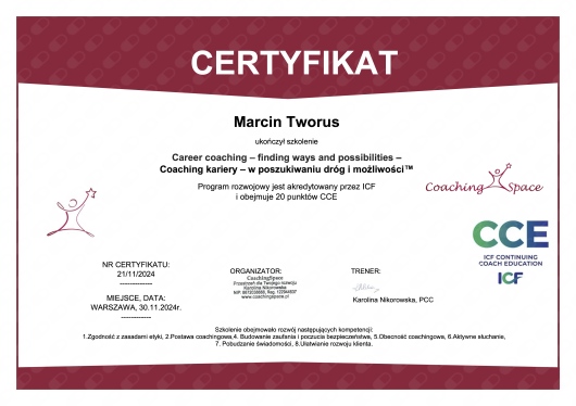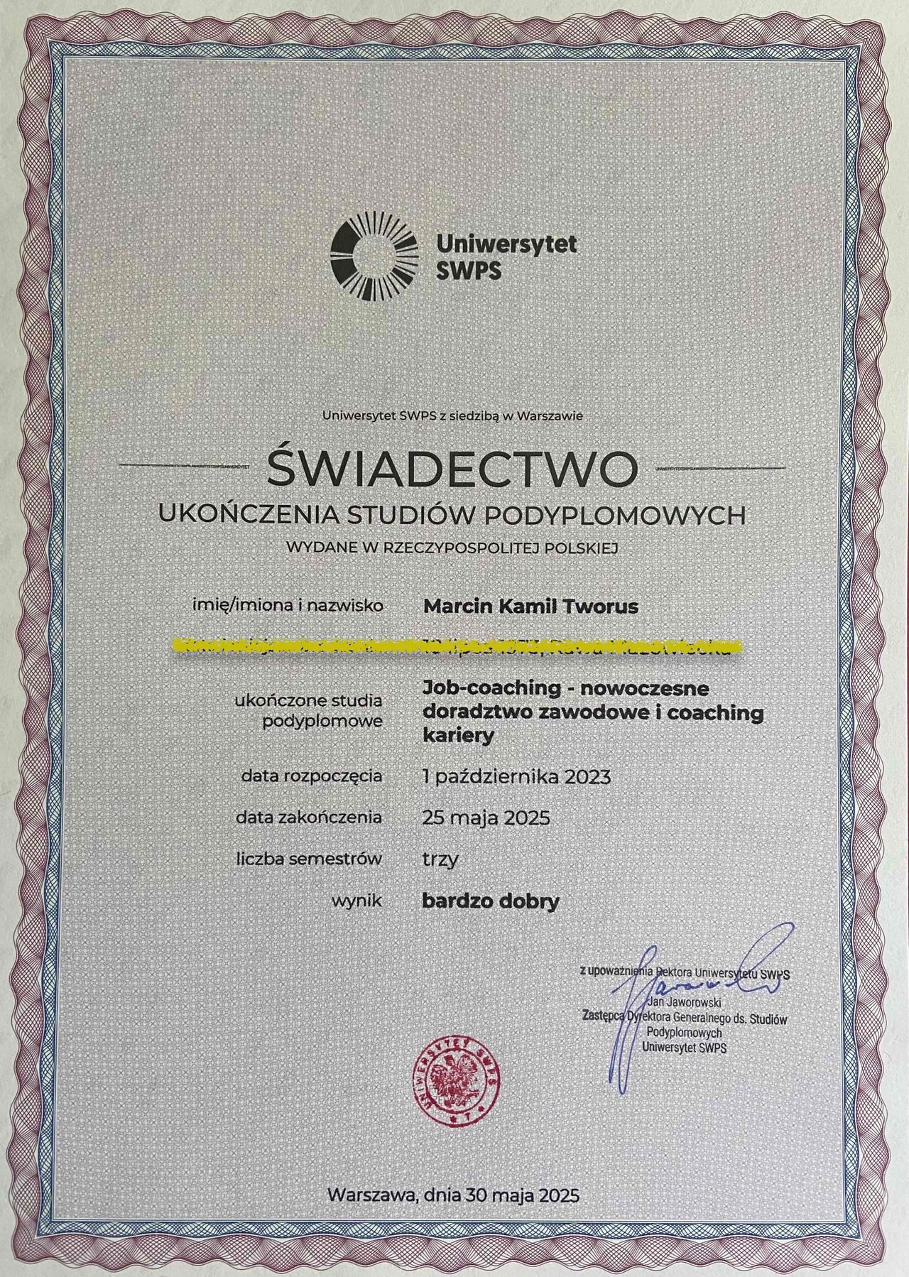 Już po kilku miesiącach intensywnej współpracy z Marcinem odzyskałem poczucie sprawczości i wyraźnie widzę swój progres. Komunikacja z nim zawsze jest przyjemna i wspierająca. Z pełnym przekonaniem polecam Marcina jako świetnego specjalistę.