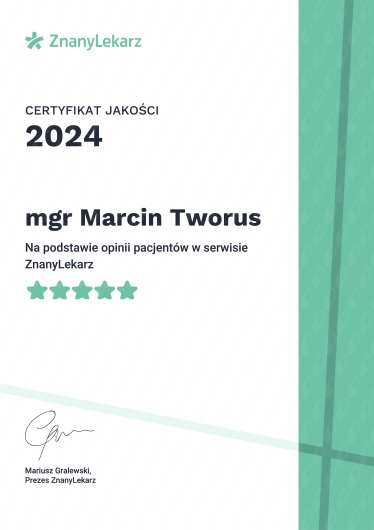 Jeśli miałbym powiedzieć w dwóch słowach jak wygląda profesjonalizm mowę Marcin Tworus. Moja terapia u Pana Marcina zaczęła się niecałe 2 miesiące temu i w tak krótkim czasie zdążyłem się tak wiele o sobie dowiedzieć, a wiem że im dalej w las tym będzie coraz jaśniej dzięki temu, że Marcin potrafi stworzyć genialną przestrzeń do otworzenia się trafne pytania świetne tłumaczenia skąd co wynika utwierdza mnie w przekonaniu, że trafiłem na profesjonalistę w swoim fachu. Gorąco polecam jeśli ktoś szuka dobrego terapeuty, nie zawsze jest łatwo, ale zawsze jest szczerze, rzetelnie i z poczuciem że jest się w miejscu z którego wychodzi się coraz bardziej świadomym samego siebie.