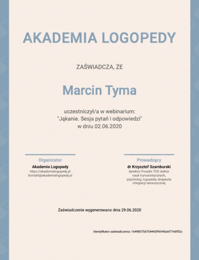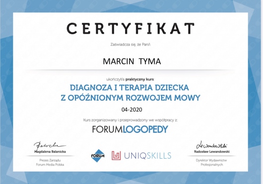 Jestem magistrem Logopedii i Filologii polskiej, absolwentem Uniwersytetu Warszawskiego, we współpracy z Warszawskim Uniwersytetem Medycznym. Moje doświadczenie wzbogaciło także stypendium na paryskiej Sorbonie, gdzie studiowałem na Wydziale Literatury i Teatru.