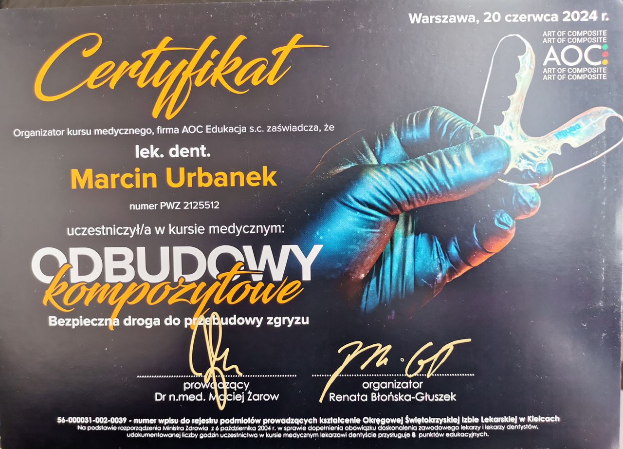 Jaki jest zakres porad oferowanych przez Marcin Urbanek?Marcin Urbanek to stomatolog. Na podstawie swojego doświadczenia i wykształcenia Marcin Urbanek oferuje usługi takie jak: Konsultacja stomatologiczna, Wypełnienie, korona cyrkonowa, konsultacja protetyczna, leczenie próchnicy, odbudowa zębów, protezy, stomatologia estetyczna, Stomatologia zachowawcza, wypełnienie kompozytowe.