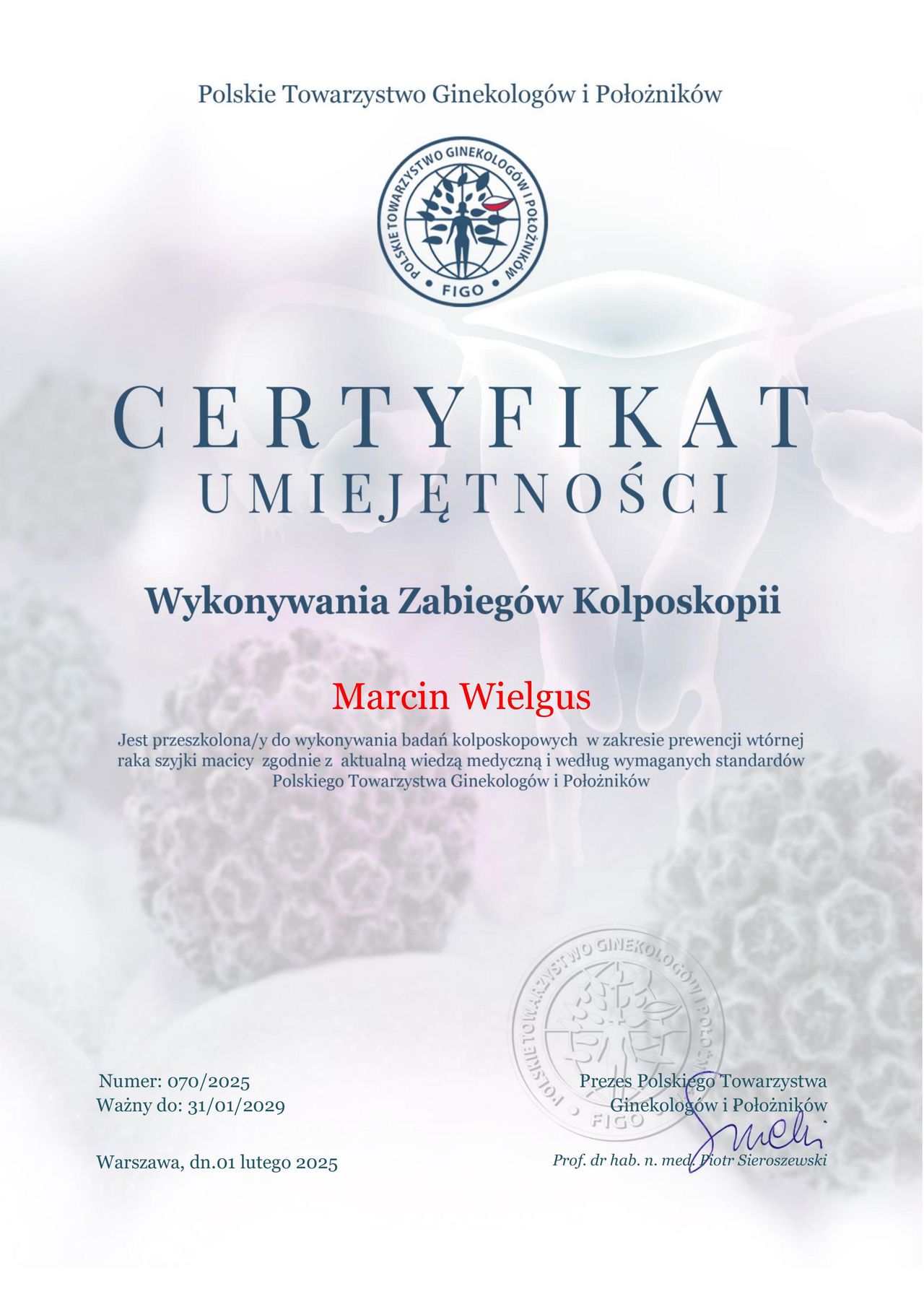 Posiadam certyfikaty Polskiego Towarzystwa Ginekologów i Położników w zakresie ultrasonografii ginekologiczno-położniczej oraz kolposkopii, co pozwala na precyzyjną diagnostykę i indywidualne podejście do każdej pacjentki.