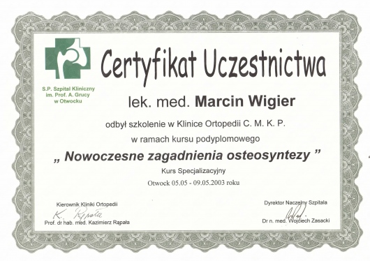- ponad 300 operacji zespolenia złamań kości metodą AO (zespolenia złamań śródstawowych, zespolenia kości długich, zespolenie złamań w obrębie stawów: skokowego, kolanowego, łokciowego, ramiennego, nadgarstka itp.),