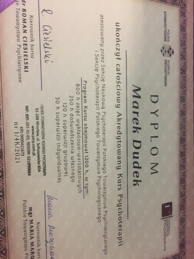 Staż psychoterapeutyczny odbyłem na Psychiatrycznym Oddziale Dziennym w Poradni Ochrony Zdrowia Psychicznego w Rudzie Śląskiej.