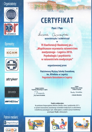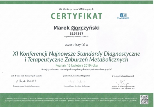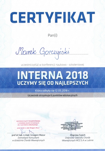 - Specjalizacja drugiego stopnia z chorób wewnętrznych od 1999 roku