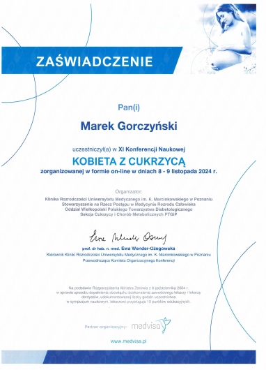 Pan Doktor bardzo mi pomógł. Trafiłam na pierwszą wizytę z cukrzycą ciążową(wcześniej stan przedcukrzycowy).Lekarz wszystko precyzyjnie mi wytłumaczył, zlecił badania oraz dopasował odpowiednie dla mnie leczenie. Każda kolejna wizyta była na najwyższym poziomie. Dziękuję i Polecam serdecznie wizytę u Pana Marka Gorczyńskiego :)