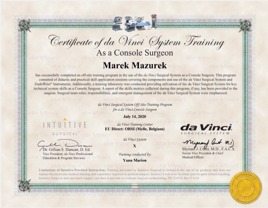 Kwalifikuję do operacji oraz operuję pacjentów z nowotworami układu pokarmowego (żołądek, jelito grube, wątroba) metodami klasycznymi, laparoskopowymi oraz w asyście robota da Vinci.