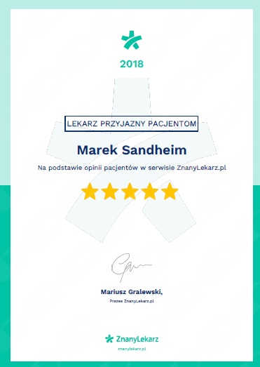 Jak Marek Sandheim umawia wizyty?Marek Sandheim używa kalendarza ZnanyLekarz, dlatego na stronie widzisz aktualne terminy. Wystarczy, że wybierzesz datę i godzinę, które odpowiadają Ci najbardziej. Umawianie wizyty jest darmowe, a tuż przed terminem wyślemy Ci przypomnienie.