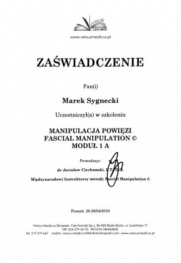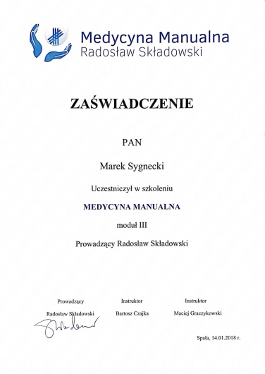 Jaki jest zakres porad oferowanych przez Marek Sygnecki?Marek Sygnecki to fizjoterapeuta. Na podstawie swojego doświadczenia i wykształcenia Marek Sygnecki oferuje usługi takie jak: Terapia manualna, konsultacja fizjoterapeutyczna, osteopatia, Stan ostry - Fizjoterapia, badanie i fizjoterapia funkcjonalna w uszkodzeniach stawu kolanowego i barkowego, Fizjoterapia pourazowa, fizjoterapia przed- i pooperacyjna, badanie układu ruchu.