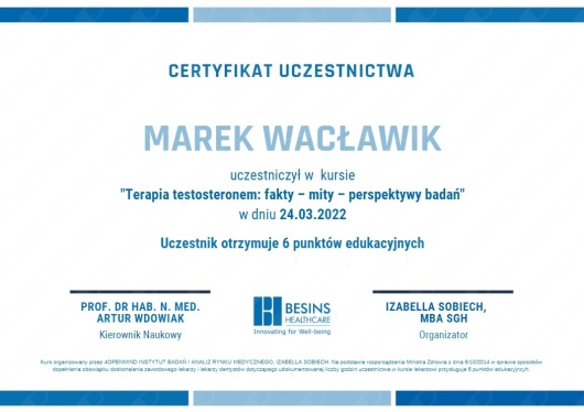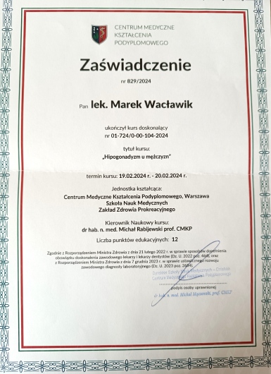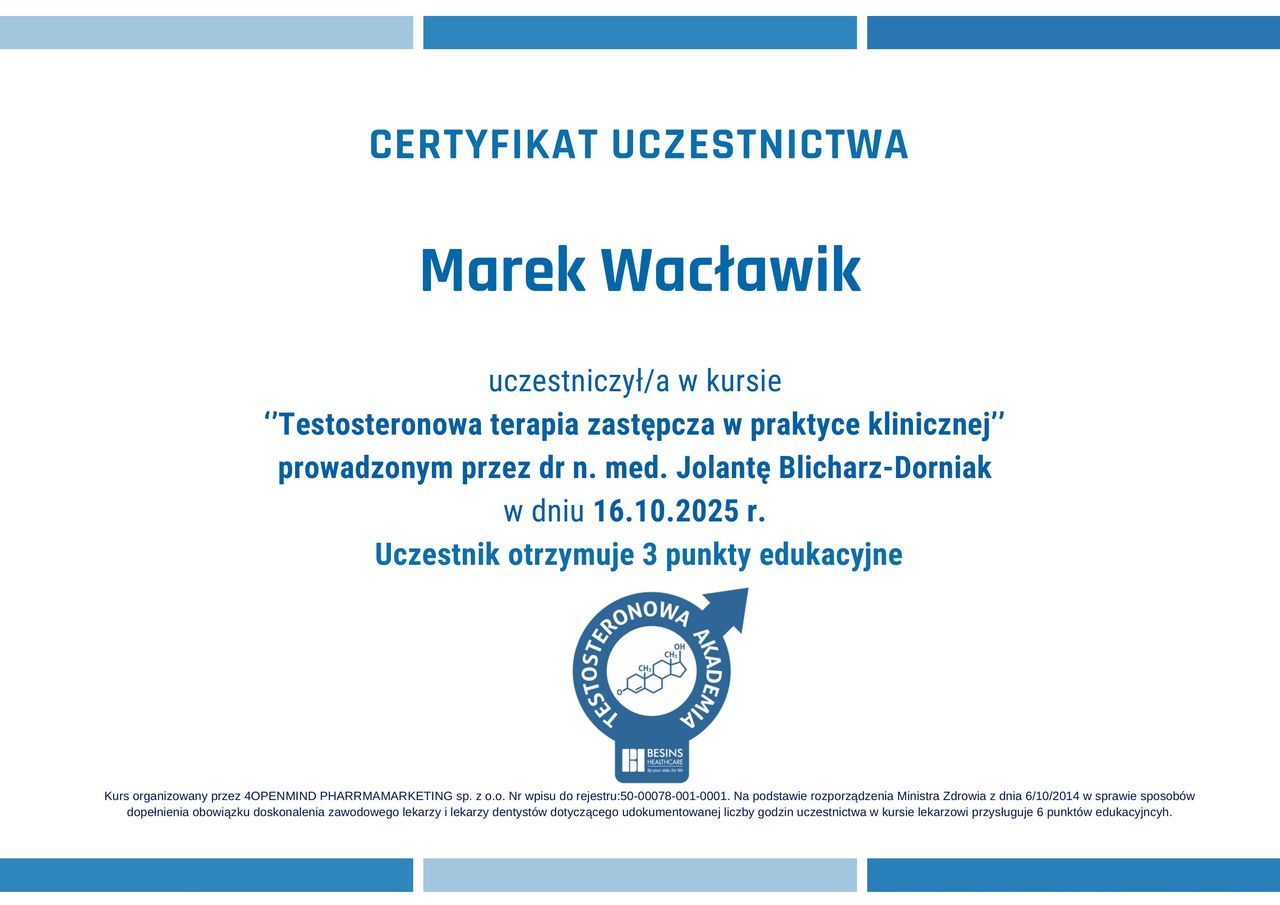 Jak Marek Wacławik umawia wizyty?Marek Wacławik używa kalendarza ZnanyLekarz, dlatego na stronie widzisz aktualne terminy. Wystarczy, że wybierzesz datę i godzinę, które odpowiadają Ci najbardziej. Umawianie wizyty jest darmowe, a tuż przed terminem wyślemy Ci przypomnienie.