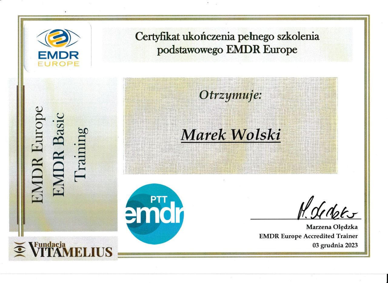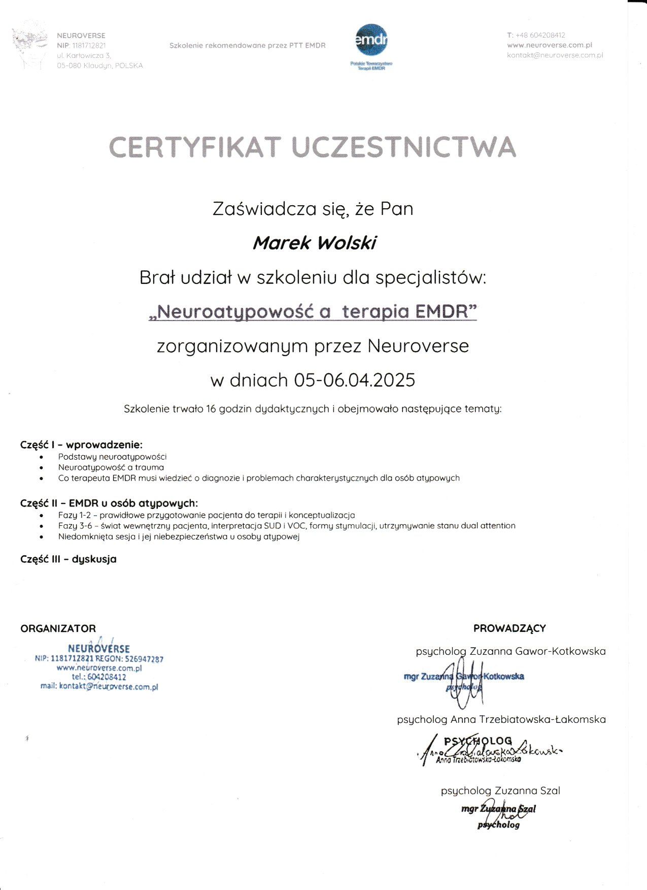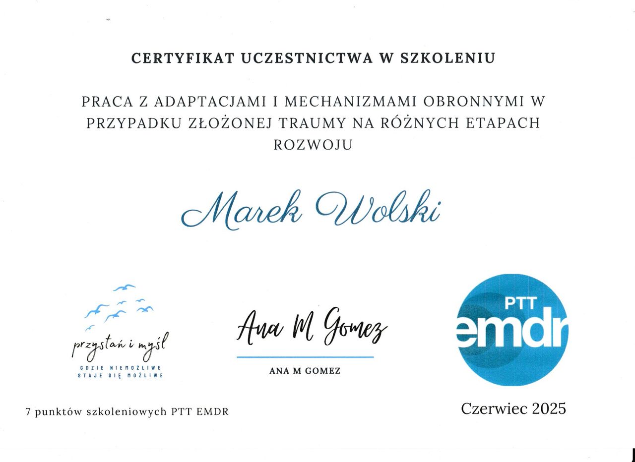 Jestem certyfikowanym terapeutą metody EMDR (Eye Movement Desensitization and Reprocessing), którą wykorzystuje w pracy z osobami dorosłymi i starszą młodzieżą (powyżej 16. r.ż.). Pomagam w problemach takich jak: zespół stresu pourazowego, zaburzenia lękowe, depresja, zaburzenia osobowości, zaburzenia adaptacyjne. Na moich spotkaniach pacjent, w bezpiecznych warunkach, będzie miał możliwość przewartościowania swoich doświadczeń w adaptacyjne rozwiązania i psychologicznie zdrową integrację.