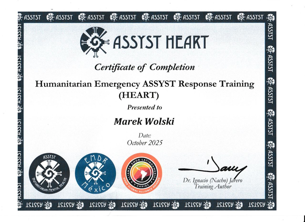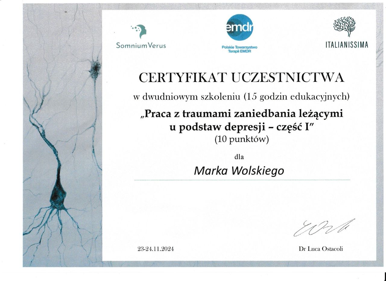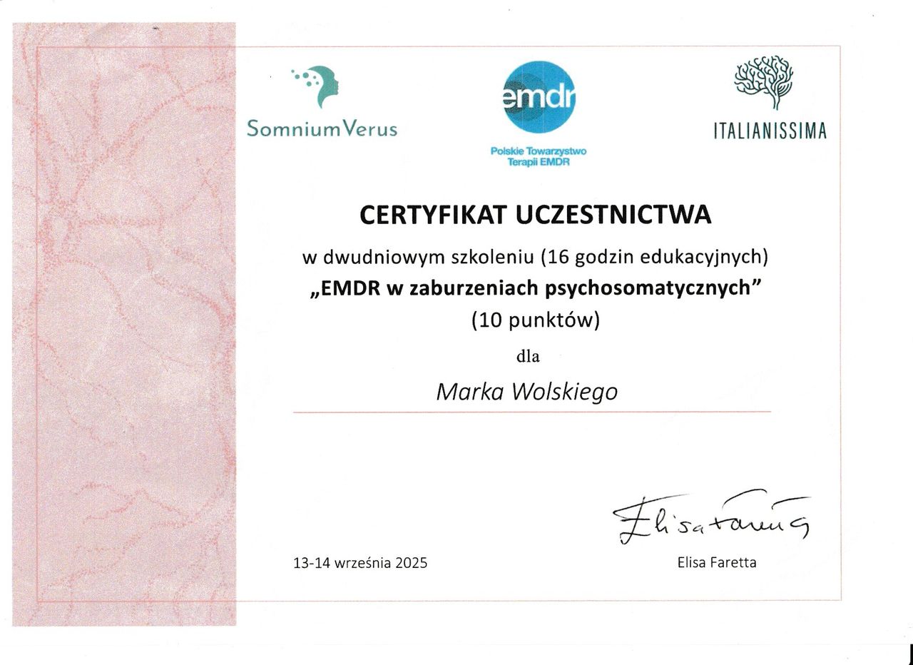 Jestem certyfikowanym terapeutą metody EMDR (Eye Movement Desensitization and Reprocessing), którą wykorzystuje w pracy z osobami dorosłymi i starszą młodzieżą (powyżej 16. r.ż.). Pomagam w problemach takich jak: zespół stresu pourazowego, zaburzenia lękowe, depresja, zaburzenia osobowości, zaburzenia adaptacyjne. Na moich spotkaniach pacjent, w bezpiecznych warunkach, będzie miał możliwość przewartościowania swoich doświadczeń w adaptacyjne rozwiązania i psychologicznie zdrową integrację.