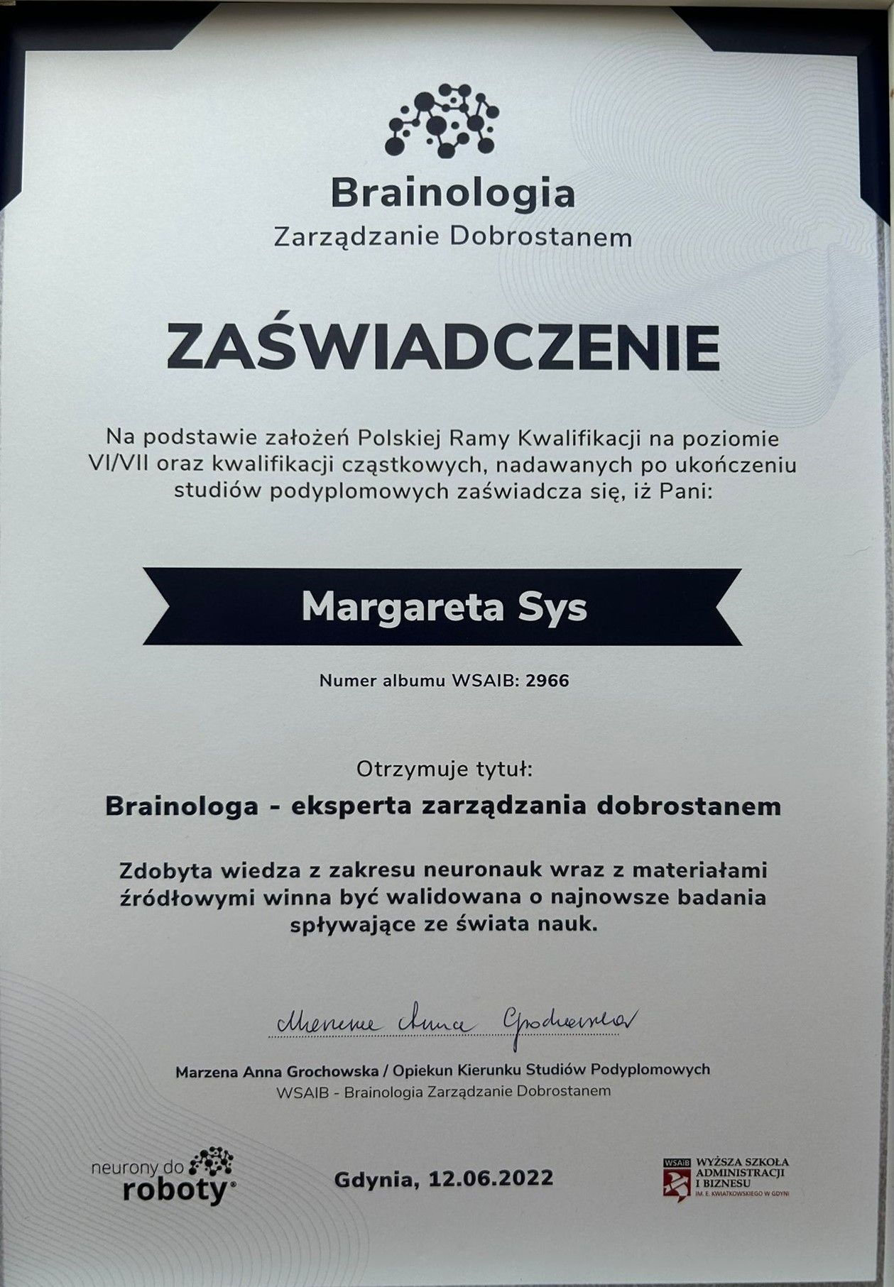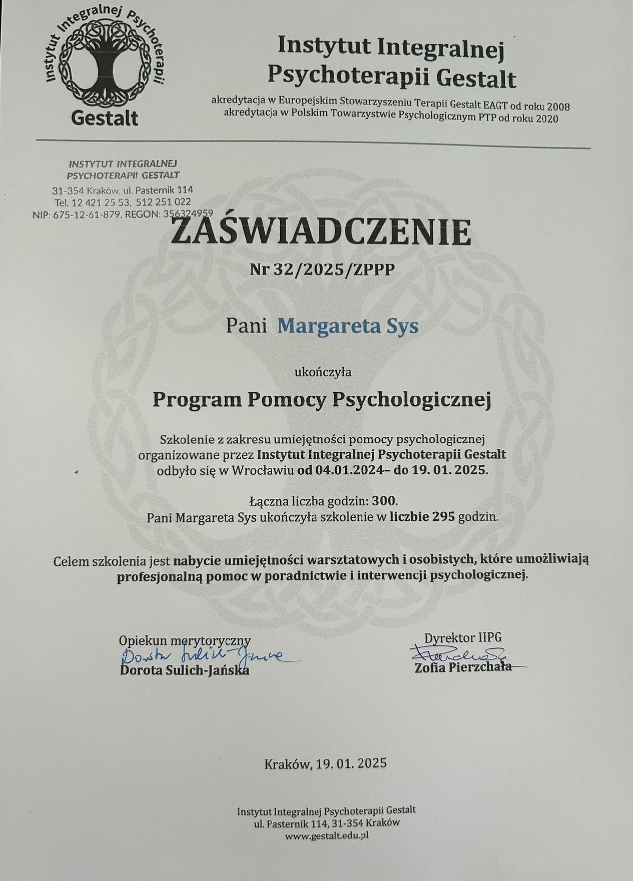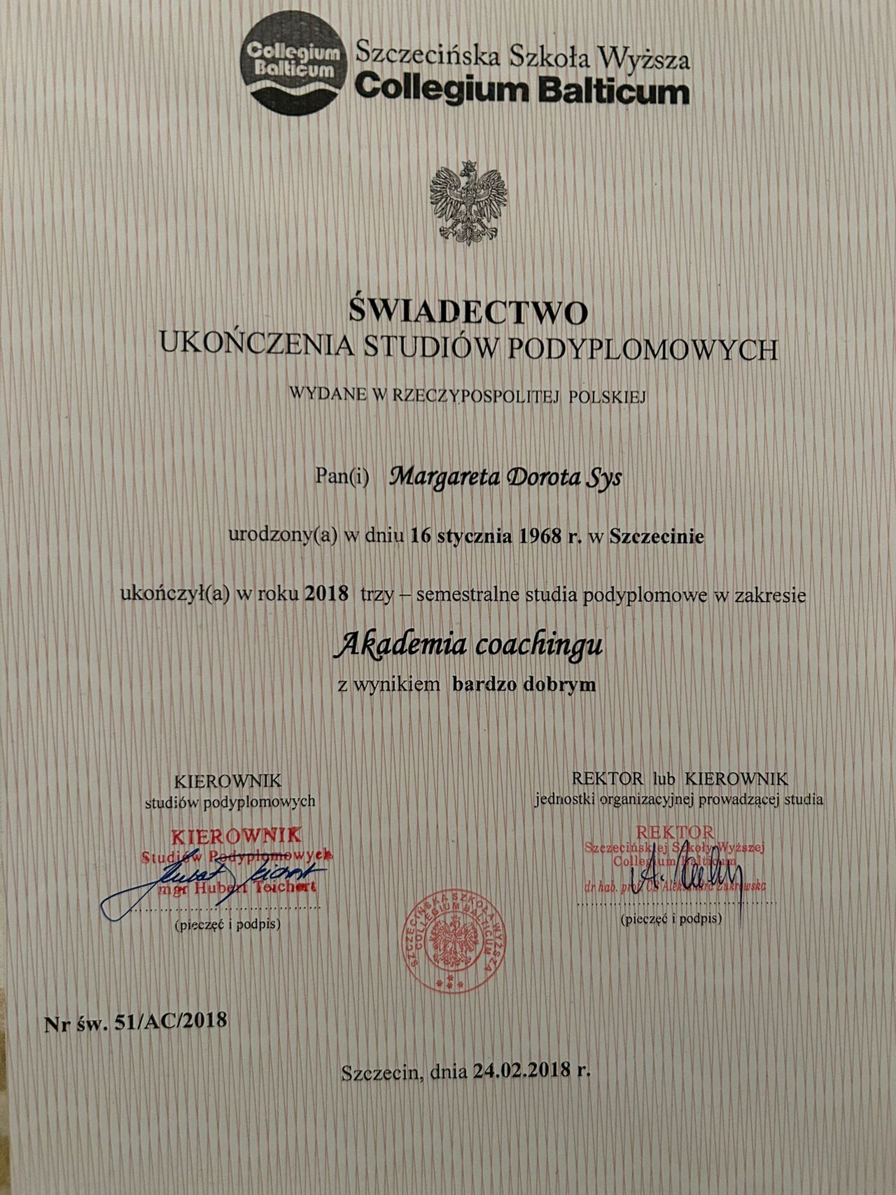 Mam na imię Margareta i od 15 lat pracuje z ludźmi w obszarze rozwoju osobistego jako Coach, Trener, Szkoleniowiec i Psychoterapeuta. Moje doświadczenie obejmuje pracę indywidualną, jak i prowadzenie warsztatów i szkoleń z psychoedukacji.