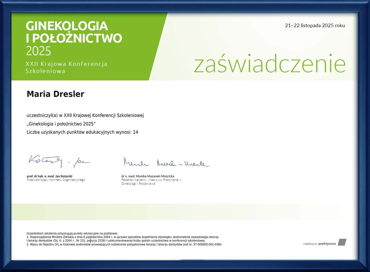 Doświadczenie zawodowe zdobywałam przez wiele lat pracując w I Klinice Ginekologii Operacyjnej i Onkologicznej Szpitala im. Madurowicza w Łodzi. W 2017 r zdobyłam tytuł specjalisty ginekologii i położnictwa oraz tytuł doktora nauk medycznych. Ukończyłam z wyróżnieniem międzynarodowe, specjalistyczne szkolenie z Medycyny Prewencyjnej i Przeciwstarzeniowej. Jestem również autorem i współautorem wielu publikacji naukowych. Na bieżąco poszerzam swoją wiedzę na licznych konferencjach i kursach.