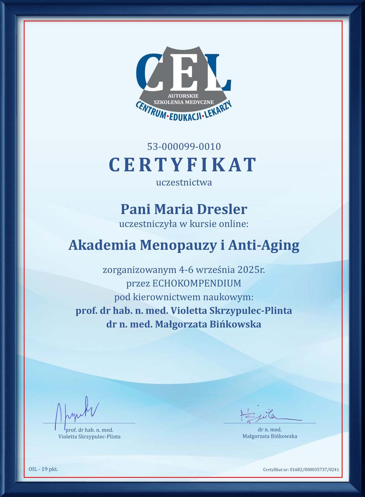 Jestem członkiem Polskiego Towarzystwa Menopauzy, Polskiego Towarzystwa Ginekologii oraz Polskiego Towarzystwa Medycyny Prewencyjnej i Przeciwstarzeniowej (Anti-Aging).