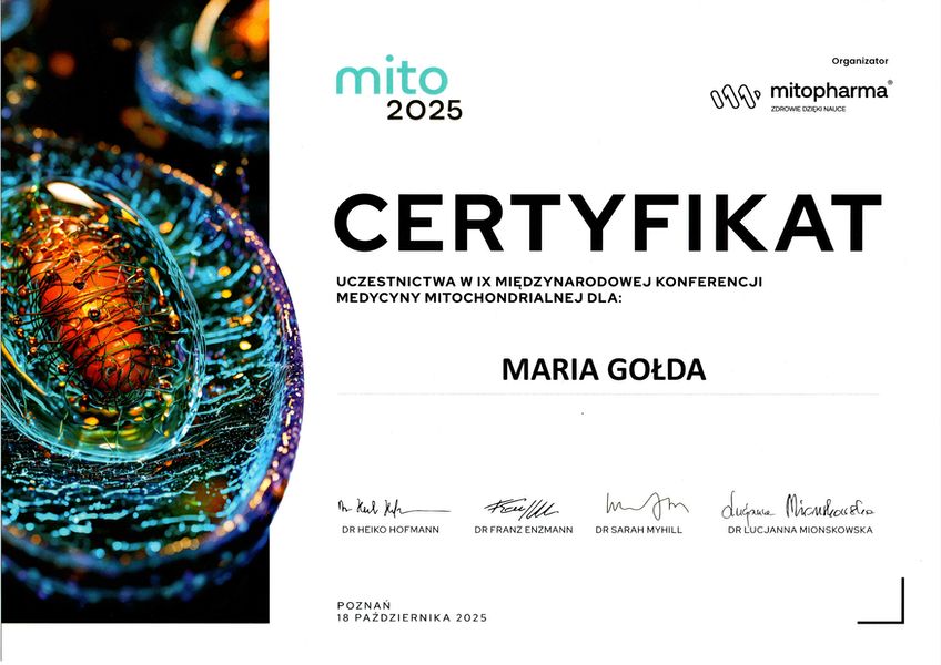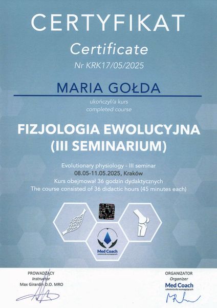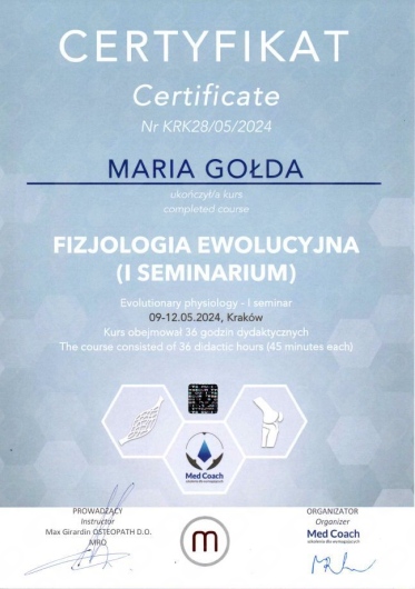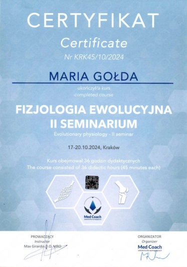 Ukończyłam kierunek lekarski na Collegium Medicum Uniwersytetu Jagiellońskiego. Uzyskałam tytuł lekarza specjalisty w dwóch dziedzinach – rehabilitacji medycznej (2016 r.) oraz medycyny sportowej (2020 r.). Dodatkowo zdobyłam wiedzę i umiejętności z zakresu osteopatii w ramach 4-letnich studiów podyplomowych w Akademii Osteopatii (2022 r.).