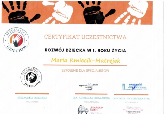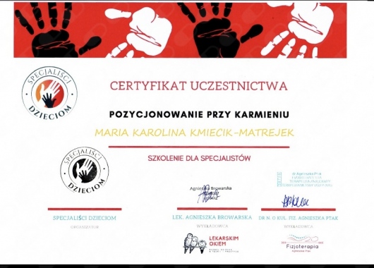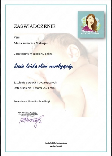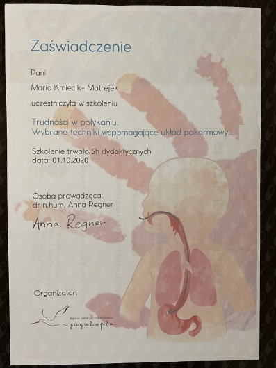 mgr Maria Kmiecik- Matrejek - logopeda, neurologopeda terapeuta ręki, terapeuta karmienia, instruktor masażu niemowlęcego wg Petera Walkera, mioterapeuta