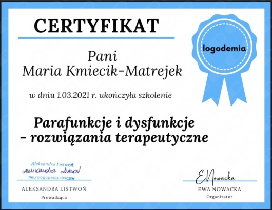 Logoro, marzec 2021 „Ocena funkcjonalna traktu ustno- twarzowego, mioterapia. Podejście autorskie” – Ewelina Mendala Kwoczek