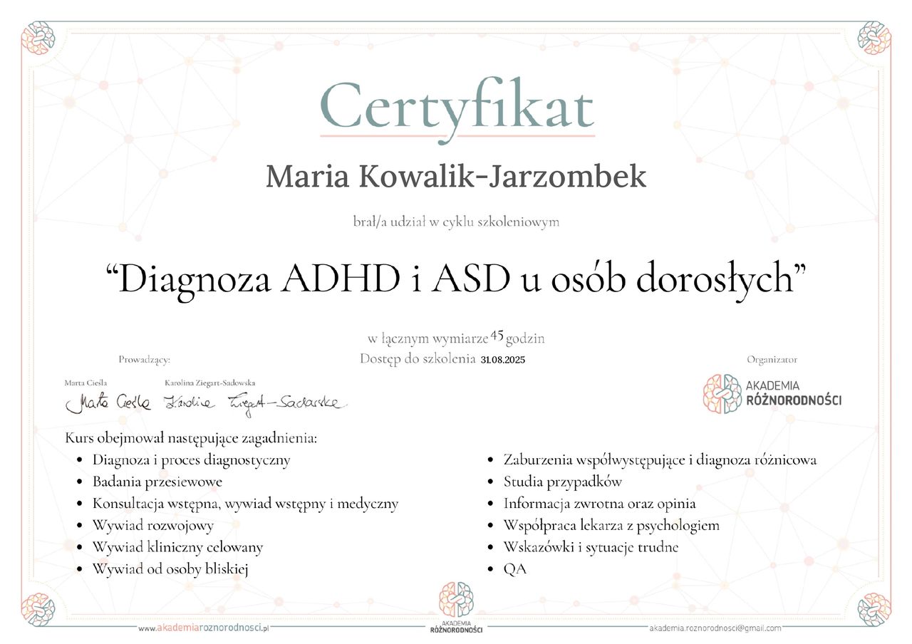 Szkolenie odbyłam w Akademii Różnorodności i stosując się do aktualnych standardów prowadzę kompleksowy proces diagnostyczny. Opieram go o diagnozę różnicową, czyli biorę pod uwagę wszystkie możliwe powody występowania danego objawu. Czasami oznacza to, że wykonujemy testy również pod kątem na przykład depresji, aby przygotowana przeze mnie opinia była kompletna. Spotkania zazwyczaj przebiegają w takiej kolejności: