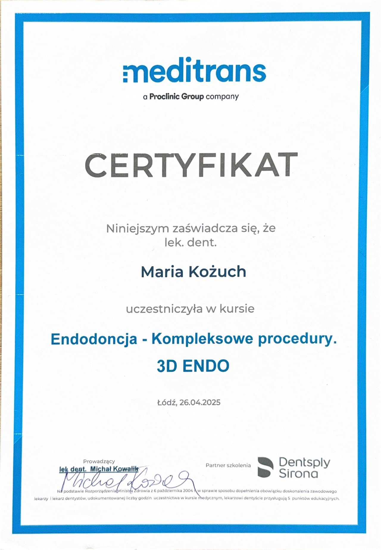 Jestem absolwentką Uniwersytetu Medycznego w Łodzi. Staż podyplomowy odbyłam w Instytucie Stomatologii Centralnego Szpitala Klinicznego w Łodzi, gdzie budowałam cenne doświadczenie pod okiem specjalistów z wieloletnim doświadczeniem. Nieustannie poszerzam swoją wiedzę i umiejętności, biorąc czynny udział w kursach i szkoleniach specjalistycznych. W pracy z Pacjentem zależy mi na dbałości o szczegóły i stworzeniu komfortowej atmosfery. Szczególnie interesuje mnie endodoncja, ale nie ograniczam się do zabiegów tylko w tej dziedzinie.