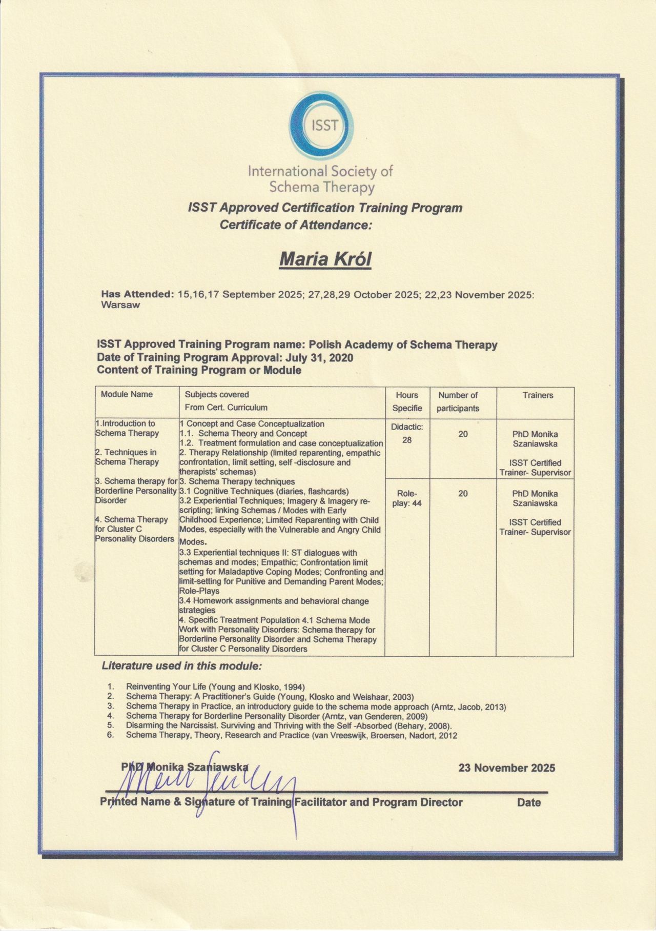 Obecnie jestem w procesie pogłębiania wiedzy i umiejętności, w nurcie psychoterapii schematów.