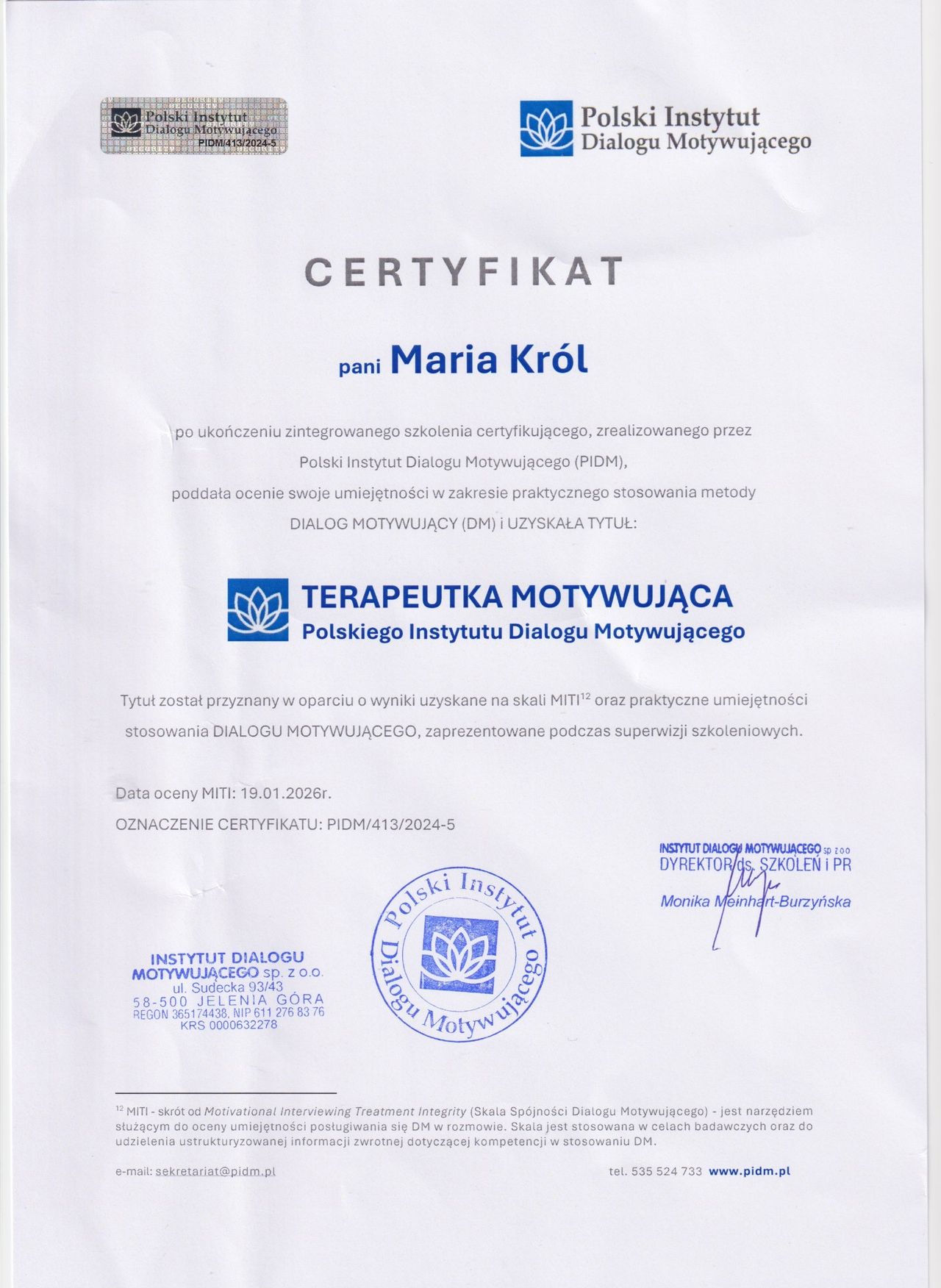W swojej pracy korzystam także z narzędzi Dialogu Motywującego. Jako certyfikowana Terapeutka Dialogu Motywującego, umiejętności nabyłam w drodze szkolenia w Polskim Instytucie Dialogu Motywującego.