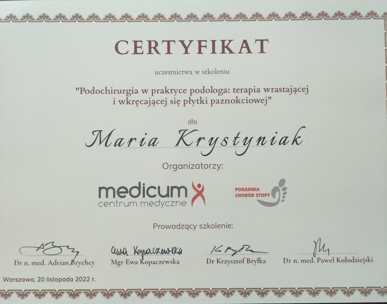 Jaki jest zakres porad oferowanych przez Maria Krystyniak?Maria Krystyniak to podolog. Na podstawie swojego doświadczenia i wykształcenia Maria Krystyniak oferuje usługi takie jak: Konsultacja podologiczna, Leczenie wrastającego paznokcia, Klamra ortonyksyjna, zabieg podologiczny, Usuwanie brodawek (kurzajek), pękające pięty, leczenie chorób paznokci, Leczenie grzybicy paznokci i skóry, Usuwanie odcisków i modzeli.
