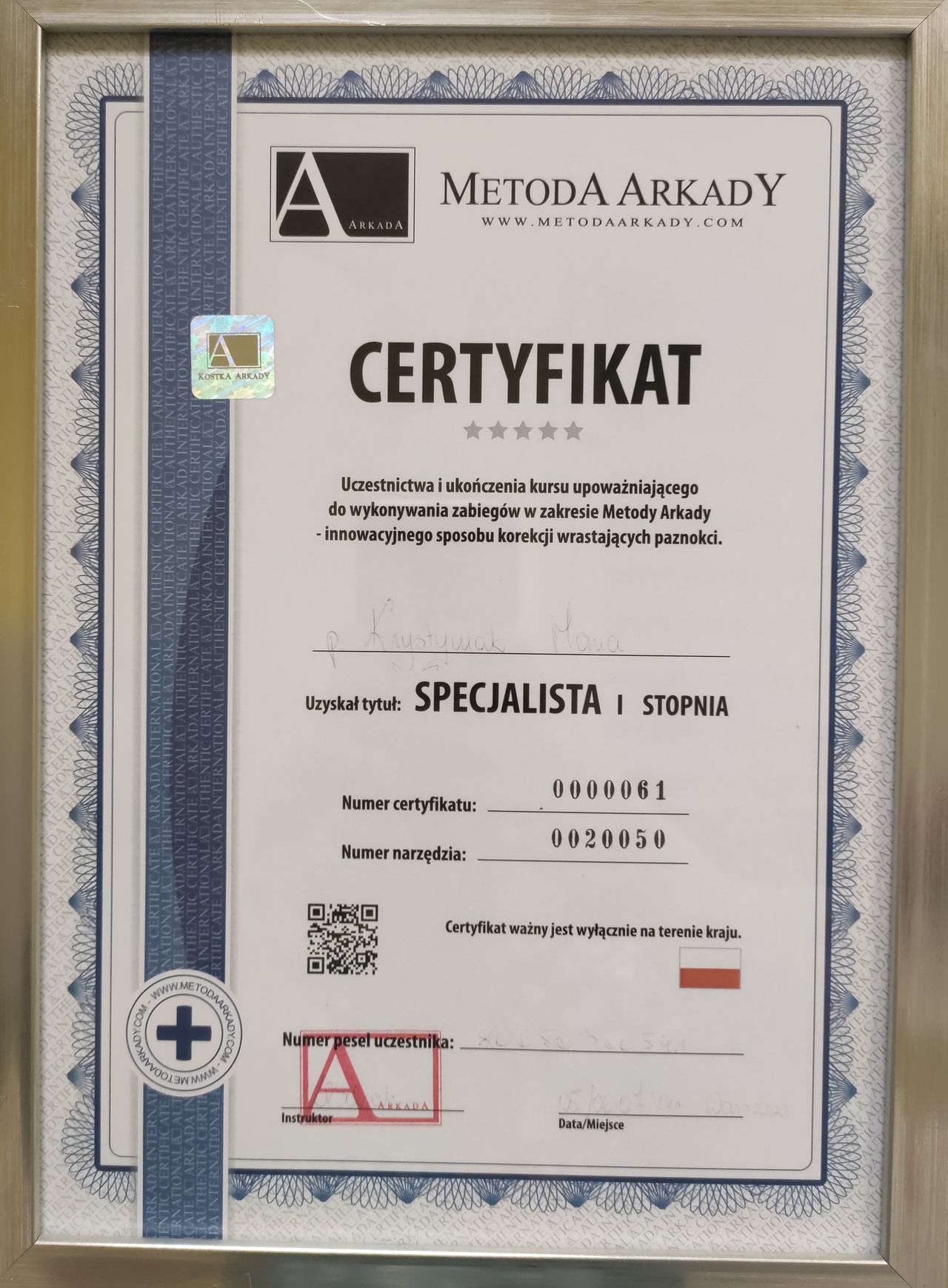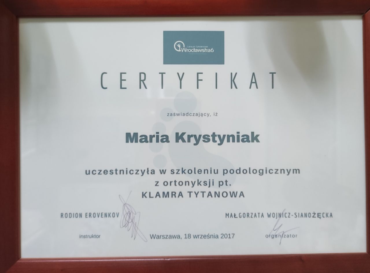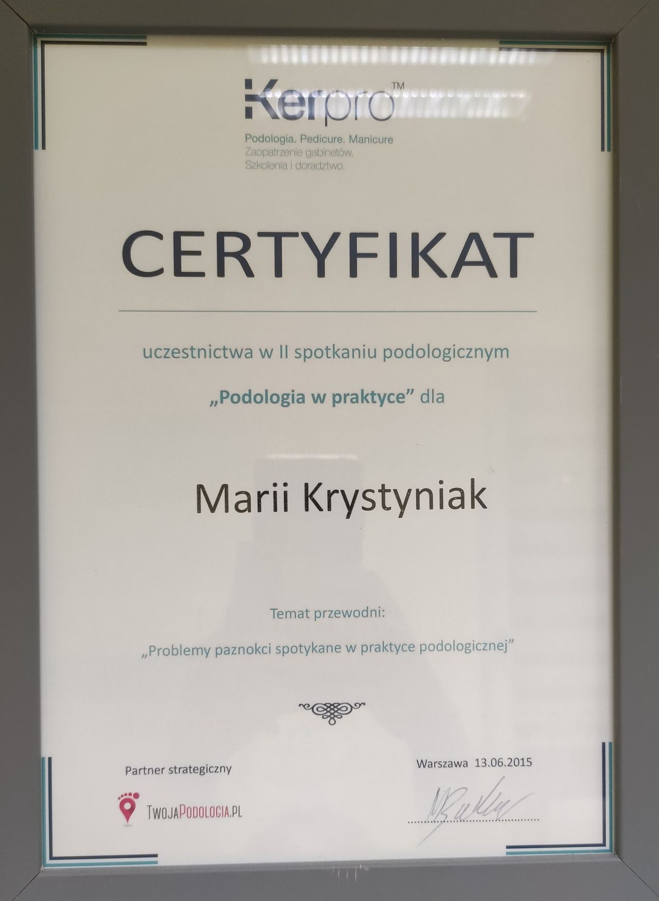 Moją rolą jest przywracanie komfortu chodzenia, zdejmowanie bólu i poprawa kondycji stóp - skóry i paznokci, a finalnie utrzymanie optymalnej estetyki i wygody. Wykorzystuję do tego wiedzę zdobytą na studiach i licznych kursach, konferencjach.