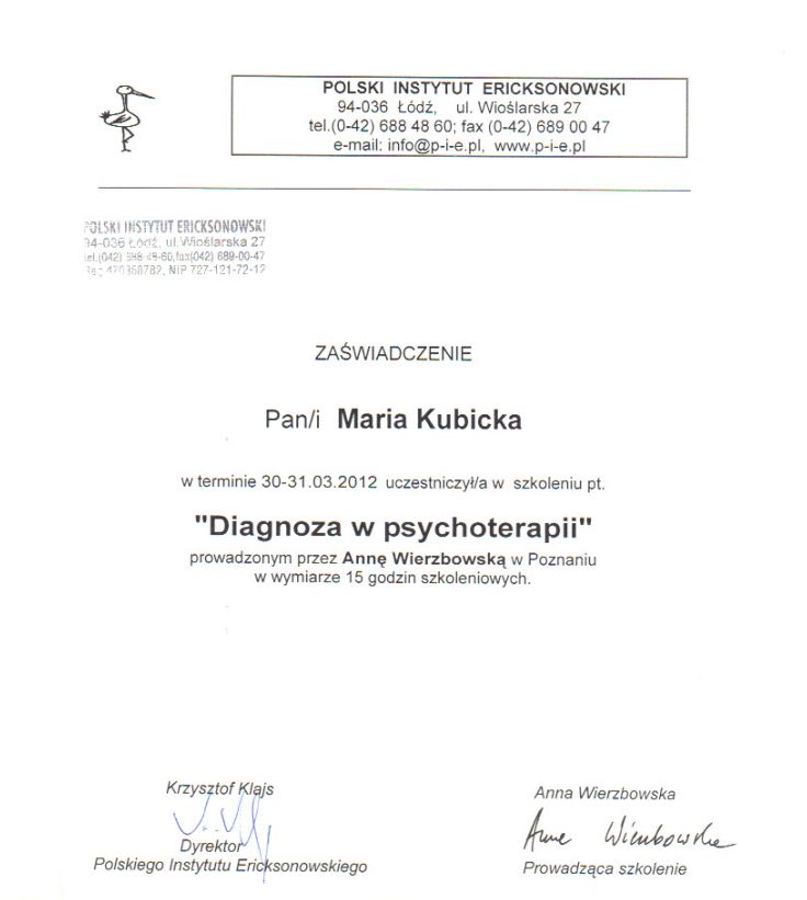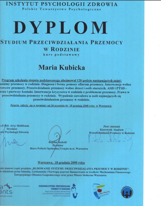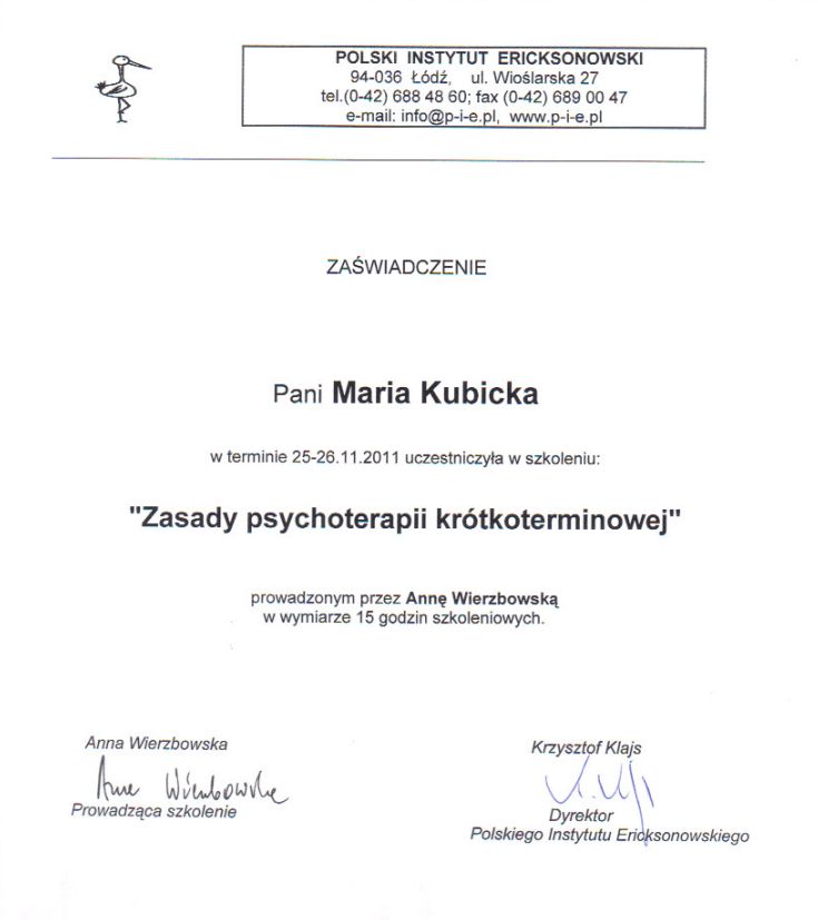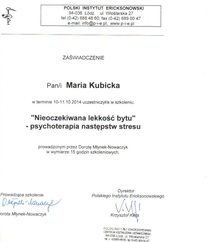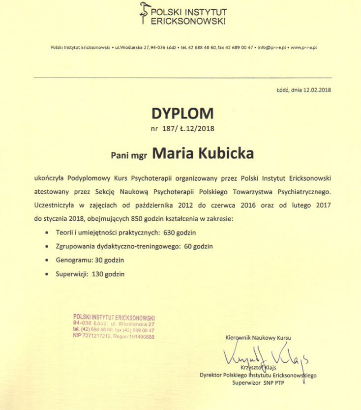 Jestem magistrem psychologii (Uniwersytet SWPS w Warszawie). Ukończyłam całościowy Kurs Psychoterapii w Polskim Instytucie Ericksonowskim – atestowany przez Sekcję Naukową Psychoterapii Polskiego Towarzystwa Psychiatrycznego – i od lat pracuję w nurcie psychoterapii ericksonowskiej. Doświadczenie zawodowe zdobywałam pracując z dziećmi z zaburzeniami rozwoju, na stażach w Młodzieżowym Ośrodku Psychoterapii i w Pogotowiu dla Ofiar Przemocy "Niebieska Linia" oraz prowadząc psychoterapię młodzieży na Oddziale Leczenia Nerwic Młodzieży w Mazowieckim Centrum Neuropsychiatrii.