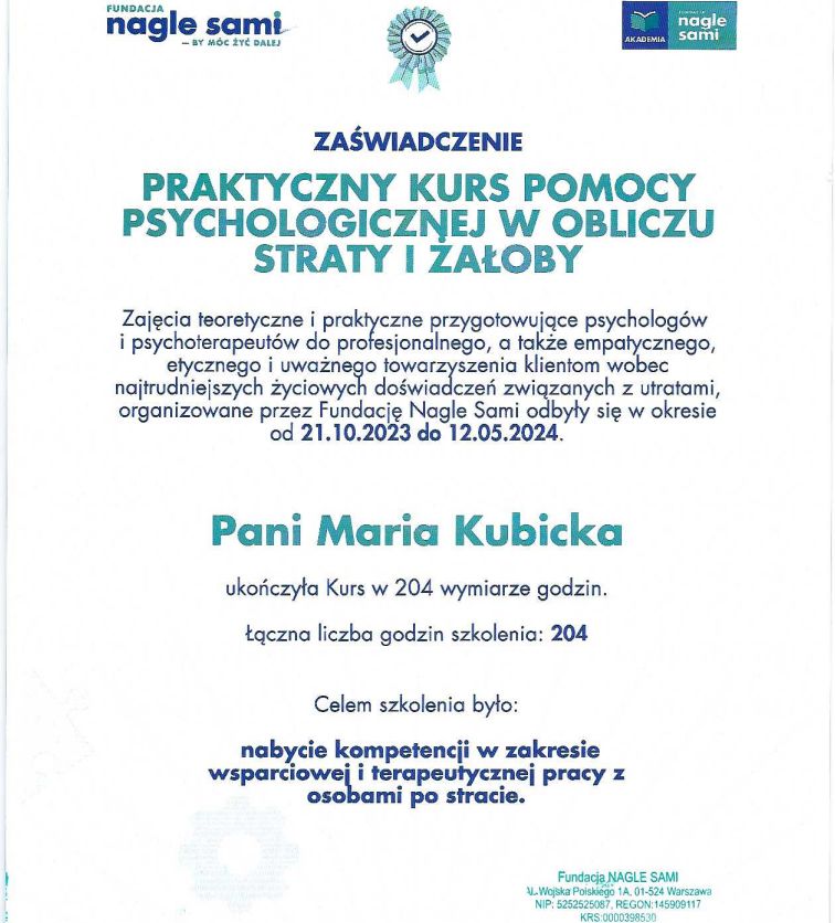 Pani psycholog okazała mi niezwykłe wsparcie w jednym z najtrudniejszych momentów mojego życia. Trafiłam do niej pogubiona, pełna bólu i poczucia bezradności po stracie bliskiej mi osoby. Dzięki wsparciu Pani Marii stopniowo odzyskiwałam równowagę i poczucie bezpieczeństwa. Stworzyła ona przestrzeń, w której mogłam swobodnie mówić o swoim cierpieniu, a jednocześnie uczyła mnie, jak radzić sobie z emocjami i krok po kroku wracać do normalności. Jestem jej ogromnie wdzięczna i polecam każdemu.
