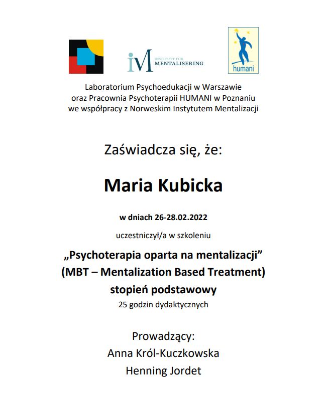 Systematycznie superwizuję swoją pracę i uczestniczę w szkoleniach doskonalących – m.in. z zakresu terapii opartej na mentalizacji (MBT) oraz wsparcia w żałobie i stracie.