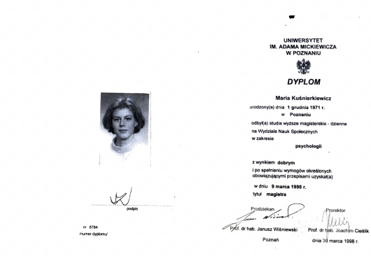Jestem doktorantką na kierunku Pedagogika WSE UAM, specjalistką psychologii klinicznej, neuropsychologiem, psychoonkologiem. Ukończyłam Psychologię na Wydziale Nauk Społecznych Uniwersytetu im. Adama Mickiewicza w Poznaniu (1996 r.). Od 1997 r. do stycznia 2009 r. pracowałam w Klinice Otolaryngologii i Onkologii Laryngologicznej Uniwersytetu Medycznego w Poznaniu. Od marca 2007 r. pracuję w Wielkopolskim Centrum Onkologii im. Marii Skłodowskiej-Curie. Jestem absolwentką 4-letniego Podyplomowego Kursu Psychoterapii organizowanego przez Wielkopolskie Towarzystwo Terapii Systemowej.