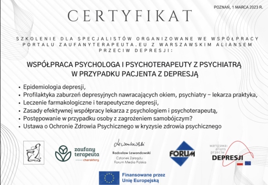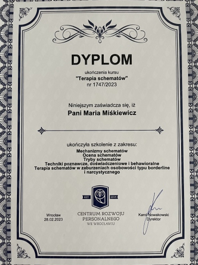 Obecnie jestem w trakcie czteroletniego szkolenia psychoterapeutycznego w nurcie CBT.